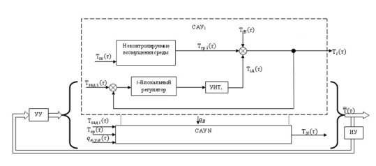 Рис. 1. Обобщенная структура САУ: УИТ – управляемый теплоисточник; - температура в i-ой из регулируемой точке; – заданная алгоритмом системы управляющего устройства температура в каждый из N регулируемых точек; – средняя температура граней, – компоненты температурного поля, обусловленные работой УИТ, неконтролируемыми возмущениями и тепловыделением измерительной аппаратуры; – температура окружающей конструкцию среды.