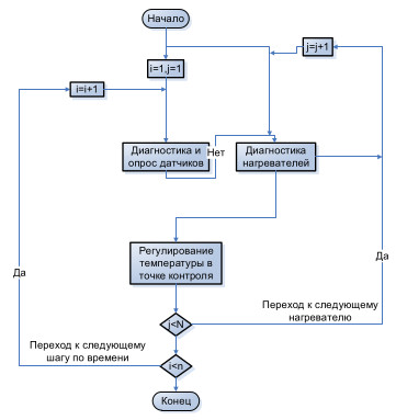 На каждом шаге работы алгоритма осуществляется диагностика отказов нагревателей. Проверка нагревателя на отказ проводится путем опроса нулевого. Признаком отказа нагревателя является отсутствие токового сигнала, что может быть связано с обрывом линии связи или неисправностью нагревателя. Если признак отказа нагревателя выявлен, то соответствующая пара нагревателей принудительно отключается.