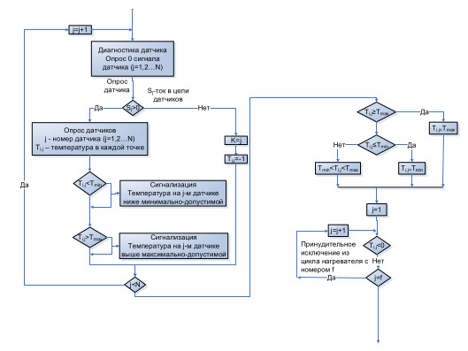 На каждом шаге работы алгоритма осуществляется диагностика отказов датчиков. Проверка датчика на отказ проводится путем выявления нулевого токового сигнала. Признаком отказа датчика является отсутствие токового сигнала, что может быть связано с обрывом линии связи или неисправностью датчика. Если признак отказа датчика выявлен, то соответствующая пара нагревателей принудительно отключается.