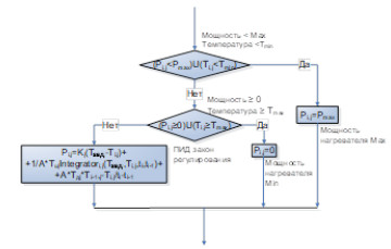 4.4. На управляющее воздействие в виде закона изменения мощности нагревателя накладывается ограничение на максимальное и минимальное значение, а также указанное значение мощности дискредитируется на 8 уровней. Схема алгоритма управления представлена на рис. 4.