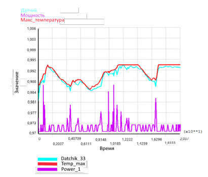 Рис. 5. Температура в контрольной точке 33, мощность нагревателя (Power_1) и текущая заданная максимальная температура конструкции (Temp_max) при рациональном алгоритме работы САР термоградиентной стабилизации конструкции