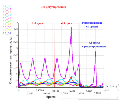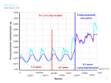 Таким образом, рациональный алгоритм термоградиентной стабилизации конструкции требует малого информационного ресурса памяти; кроме того, позволяет плавно регулировать мощность нагревателей, уменьшает время и повышает точность регулирования. К недостаткам рационального алгоритма относятся отсутствие непосредственного учета средней температуры по площади каркаса и отсутствие специального блока локального регулирования перепада температуры по толщине конструкции, который регулирует этот перепад в рамках общей температурной стабилизации всей конструкции.