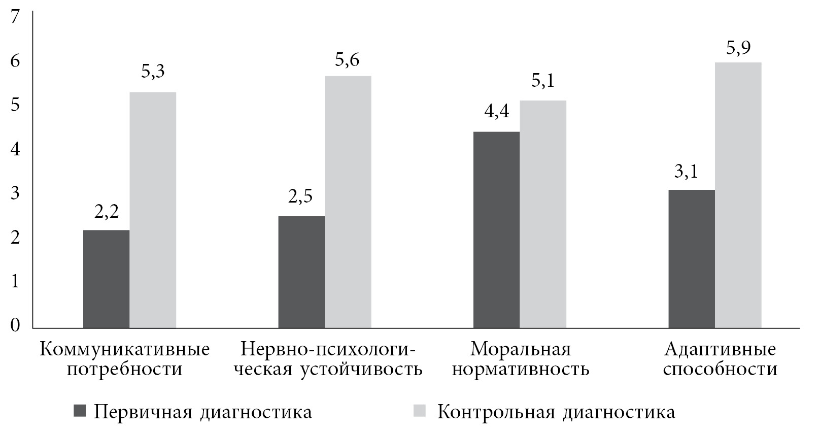 Рис. 1. Проявление адаптивности у лиц с нарушениями опорно-двигательного аппарата после психокоррекционной программы (средние значения)