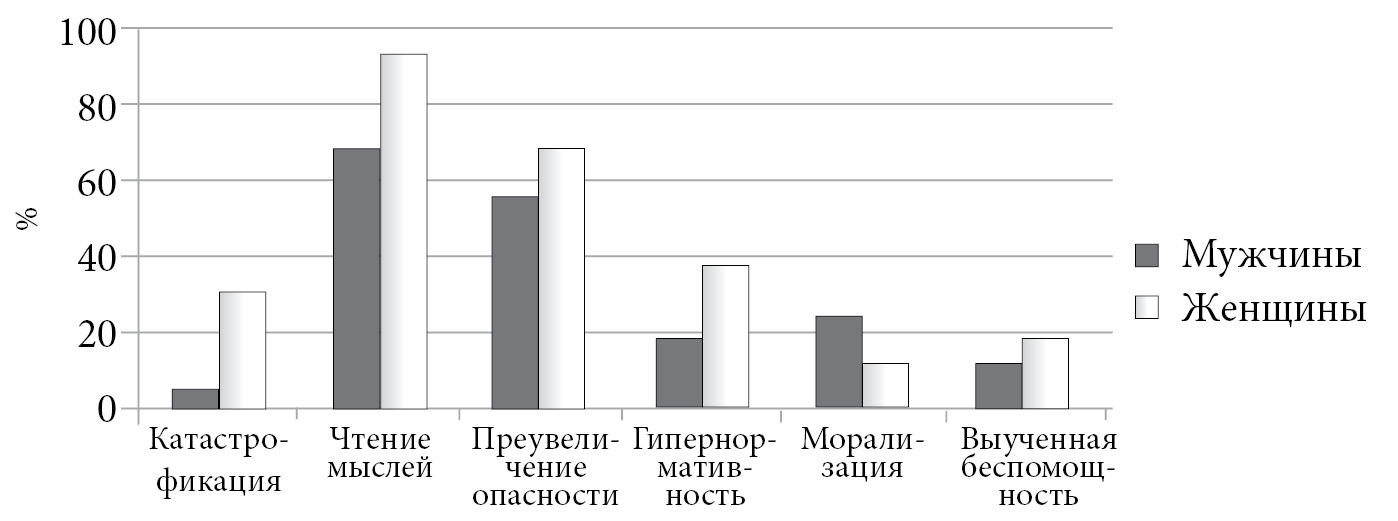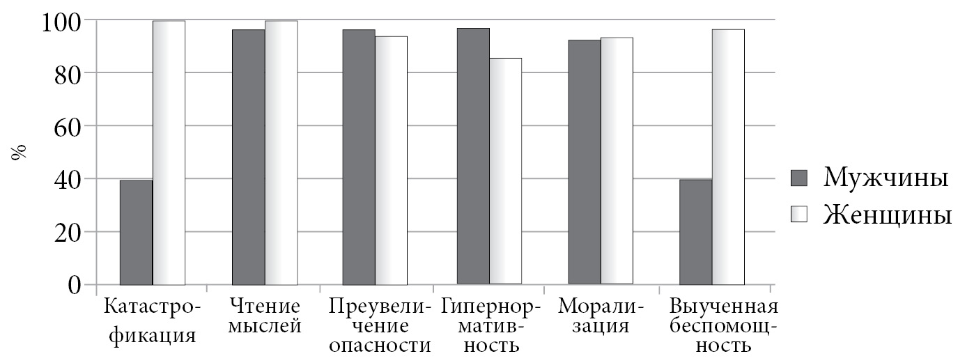 Сравнительный анализ когнитивных ошибок представителей обеих групп показал, что у респондентов из группы неактуализированных созависимых когнитивные ошибки в целом встречаются намного реже (t = 2,6, р < 0,01). Только «Чтение мыслей» и «Преувеличение опасности» показывают высокий процент присутствия в обеих группах (табл. 1, 2). Кроме того, «Чтение мыслей» присутствует у всех женщин с актуализированной созависимостью. Когнитивная ошибка «Катастрофизация» преобладает у актуализированных созависимых (t = 4,96, р < 0,001).