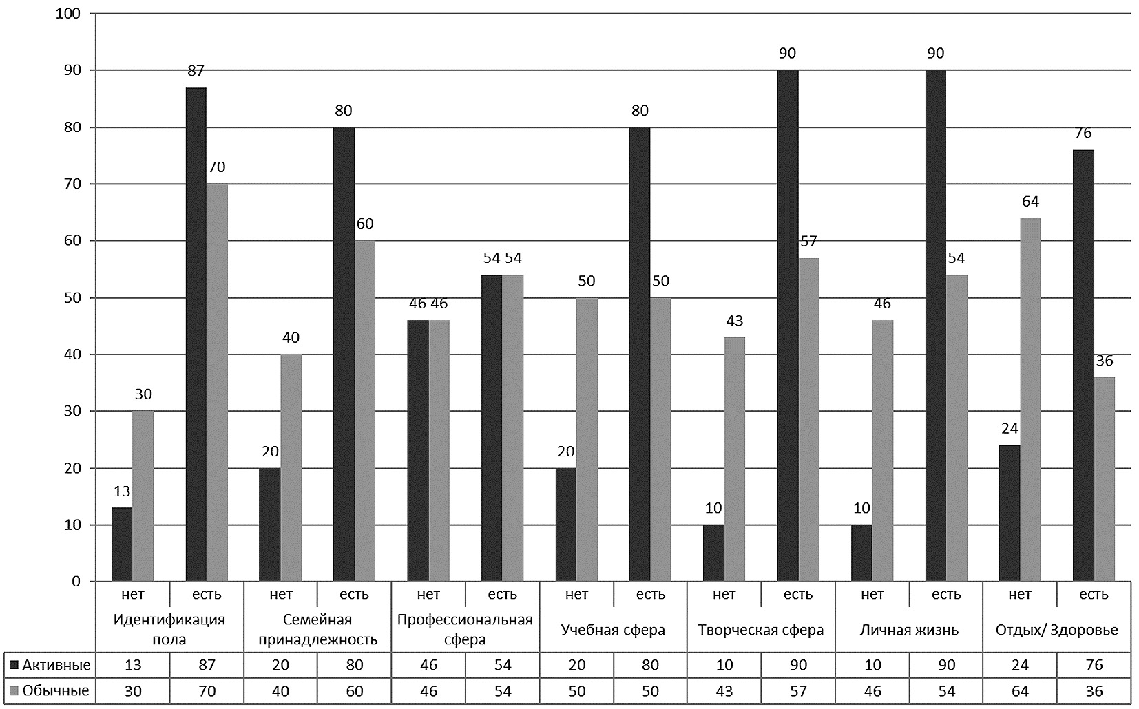 При сопоставлении данных, отраженных на рис. 2 и 3, видно, что картины выраженности и наполненности Я-образов в реале и онлайн в двух сравниваемых нами группах различны: у активных пользователей более наполненными и разнообразными оказываются характеристики сетевой идентичности, в то время как у обычных пользователей — реальной идентичности. Обнаруженные тенденции были проверены нами на значимость различий с помощью критерия углового преобразования Фишера. Значимые различия в показателях наполненности (множественности) Я-образов в реале между сравниваемыми группами обнаружены по следующим сферам: идентификация пола (p ≤ 0,05), семейная, учебная и творческая сфера, личная жизнь, отдых/здоровье (p ≤ 0,01). То есть по всем сферам реальной жизни, кроме профессиональной, в группе обычных пользователей представлено больше образов Я. Сопоставление этого же показателя для образов, представленных онлайн, дало противоположную картину различий с теми же самыми уровнями значимости: по всем сферам виртуальной жизни, кроме профессиональной, в группе активных пользователей представлено больше образов Я. Проведенный анализ доказывает наше предположение о том, активные пользователи социальных интернет-сетей имеют больше вариантов Я-образов в виртуальном пространстве.