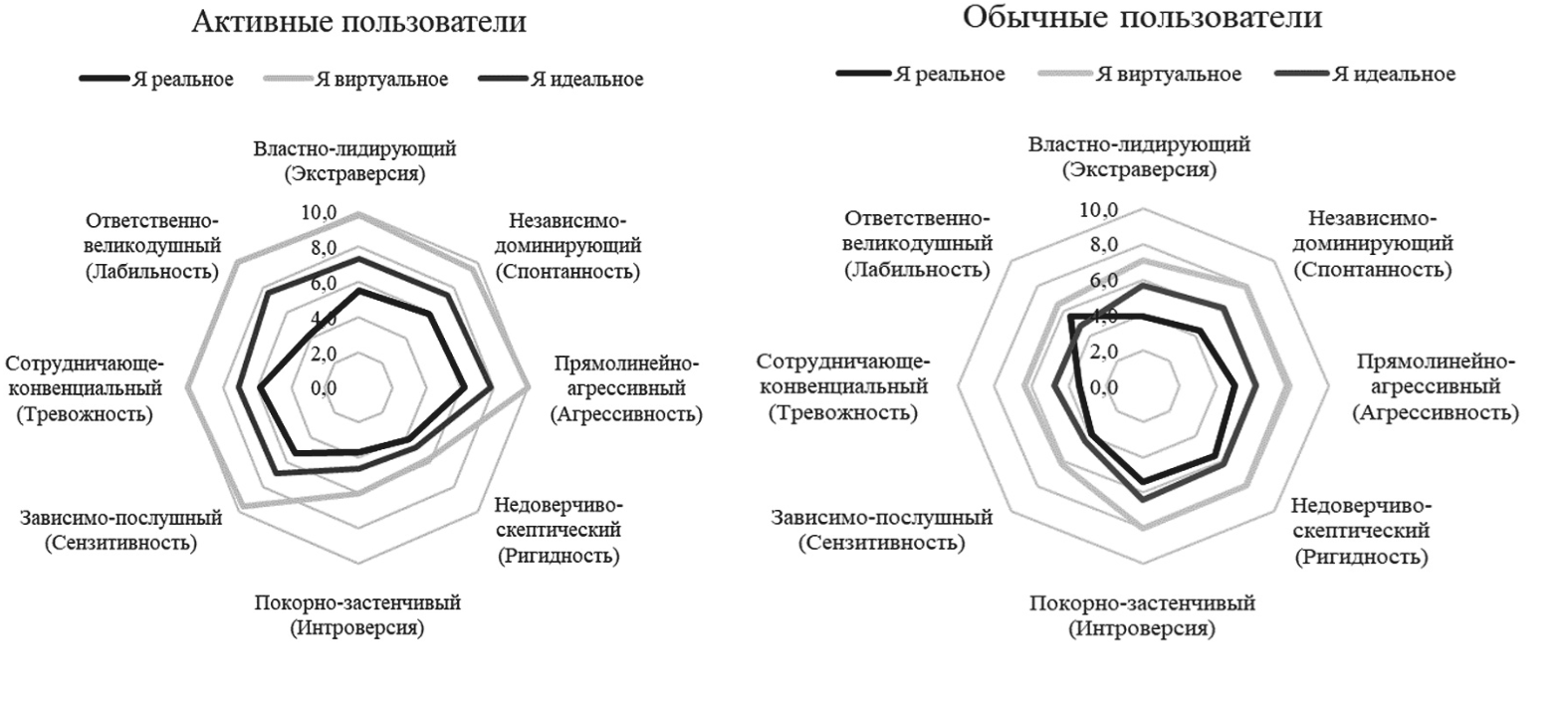 Данные описательного анализа, отраженные в табл. 2 и на рис. 4, показали, что формирование виртуального Я пользователя происходит за счет усиления выраженности властно-лидирующего, независимо-доминантного и прямолинейно-агрессивного стиля межличностного взаимодействия в сети, сопряженного с большей выраженностью по сравнению с реальным поведением таких личностных черт, как экстраверсия, спонтанность и агрессивность. Параллельно с этим процессом происходит рост проявления зависимо-послушного, сотрудничающе-конвенциального и ответственно-великодушного типа взаимоотношений на фоне большей демонстрации таких личностных черт, как тревожность, сензитивность и лабильность. То есть можно говорить о наличии двух амбивалентных тенденций — с одной стороны, виртуальная идентичность становится более доминантно-агрессивной и раскрепощенной по сравнению с реальной личностью. А с другой стороны, возрастает чувствительность по отношению к критике в свой адрес, оценке со стороны, стремление подстраиваться под изменения, происходящие в сетевом мире, альтруизм.