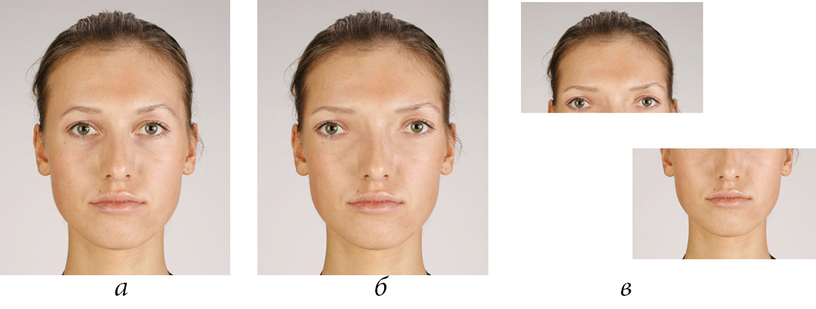 Рис. 1. Образец фотографии: а — фотоизображение физически привлекательной женщины; б — фотография с измененным межглазным расстоянием по типу орбитального гипертелоризма; в — фотография, разделенная пополам