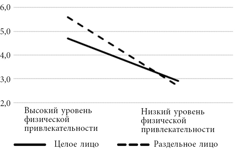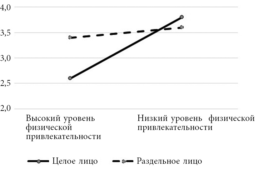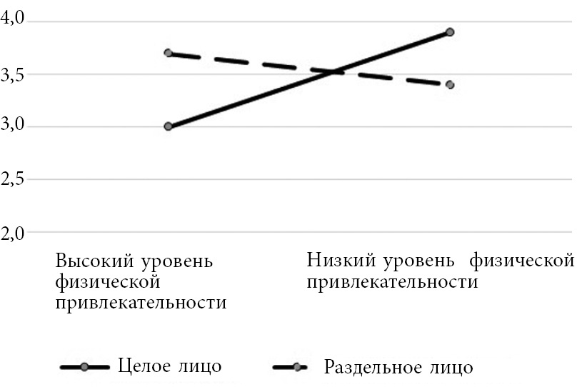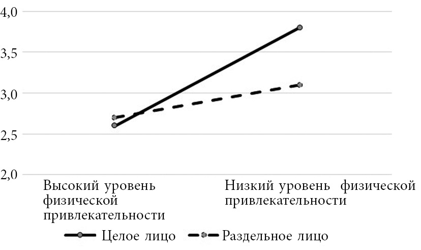 В настоящем исследовании изучается процесс формирования впечатления при восприятии физической привлекательности и лицевой стигмы дизэмбриогенеза. Гипотеза о совместном влиянии этих двух сигналов была подтверждена для социальных суждений, связанных с качествами личности, свидетельствующими о надежности человека, и криминальными гипотезами. График (рис. 2) позволяет заметить, что нарушение целостности лица оказывает различное воздействие, увеличивая оценку красоты для физически привлекательного лица и не изменяя ее для физически непривлекательного лица. Аналогичная тенденция обнаруживается при оценке опасности с учетом валентности этого социального суждения (рис. 3). То есть нарушение целостности лица способствовало повышению оценки красоты и снижению оценки опасности в зависимости от уровней физической привлекательности. Это определено уменьшением влияния стигмы в результате затруднения целостности восприятия. И физически привлекательные, и физически непривлекательные модели оцениваются выше в условиях, ограничивающих воздействие негативной лицевой информации.