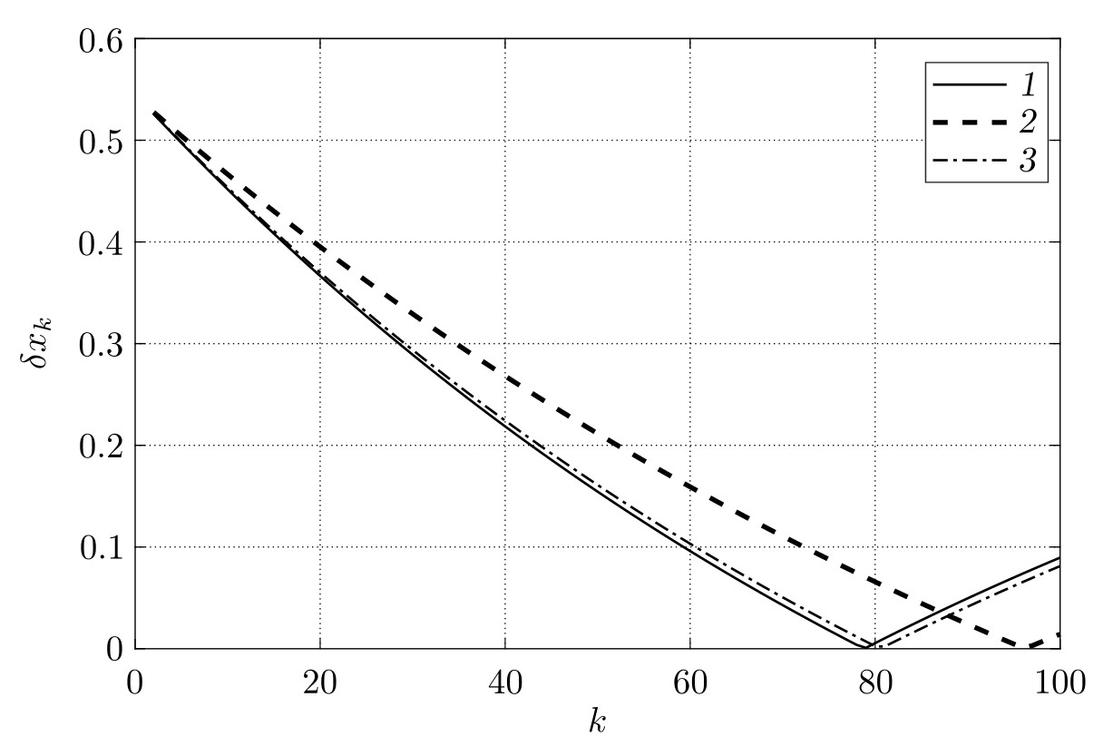 Figure 1: RMSE of the solution (8) at the k-th iteration for various values of the parameter : 1 – , 2 – ; 3 –