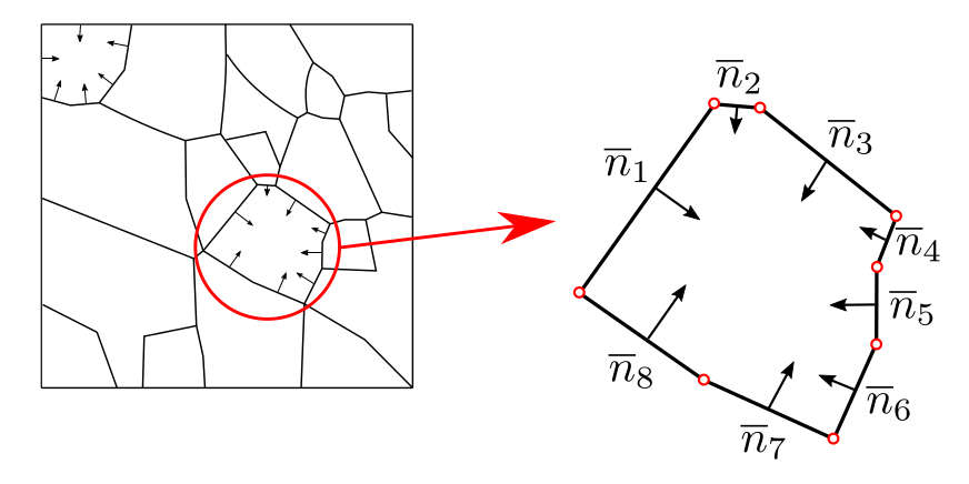 где $(x_{1} , y_{1} )$, $(x_{2} , y_{2} )$ — координаты узлов $i$-той границы зерна. Результат вычисления нормалей для отдельного зерна представлен на рис. 2.