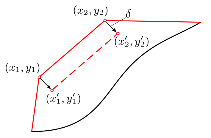 1.3. На третьем этапе для каждой границы определяется новое положение путем добавления к исходным координатам узлов смещения $\delta$, помноженного на соответствующую компоненту вектора нормали. Тогда координаты узлов $(x'_{1} , y'_{1} )$ и $(x'_{2} , y'_{2} )$ смещенной границы определяются следующим образом: