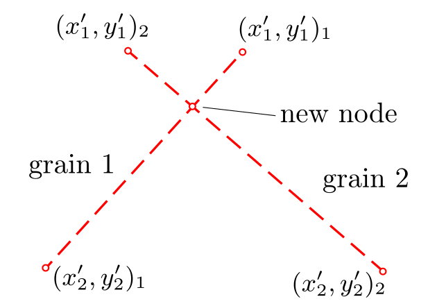 1.4. На четвертом этапе алгоритма определяются новые положения узлов зерен, совпадающие с точками пересечения прямых. Уравнения полученных прямых определяются по двум точками с новыми координатами, рассчитанными на третьем этапе алгоритма. На рис. 4 показана схема нахождения новых узлов зерен.