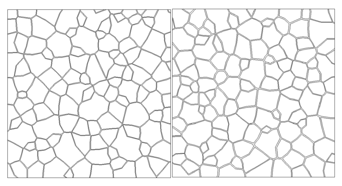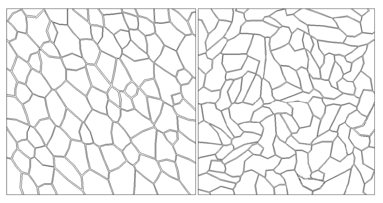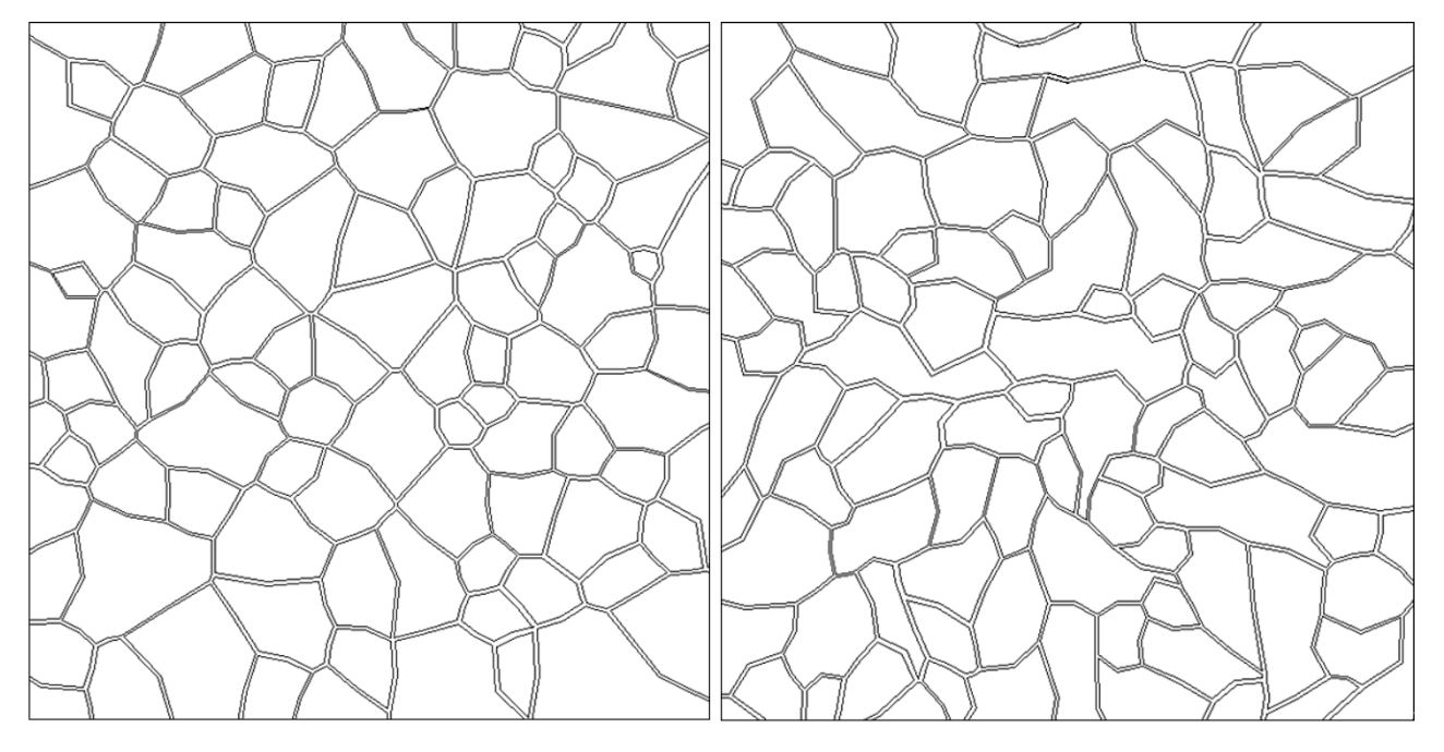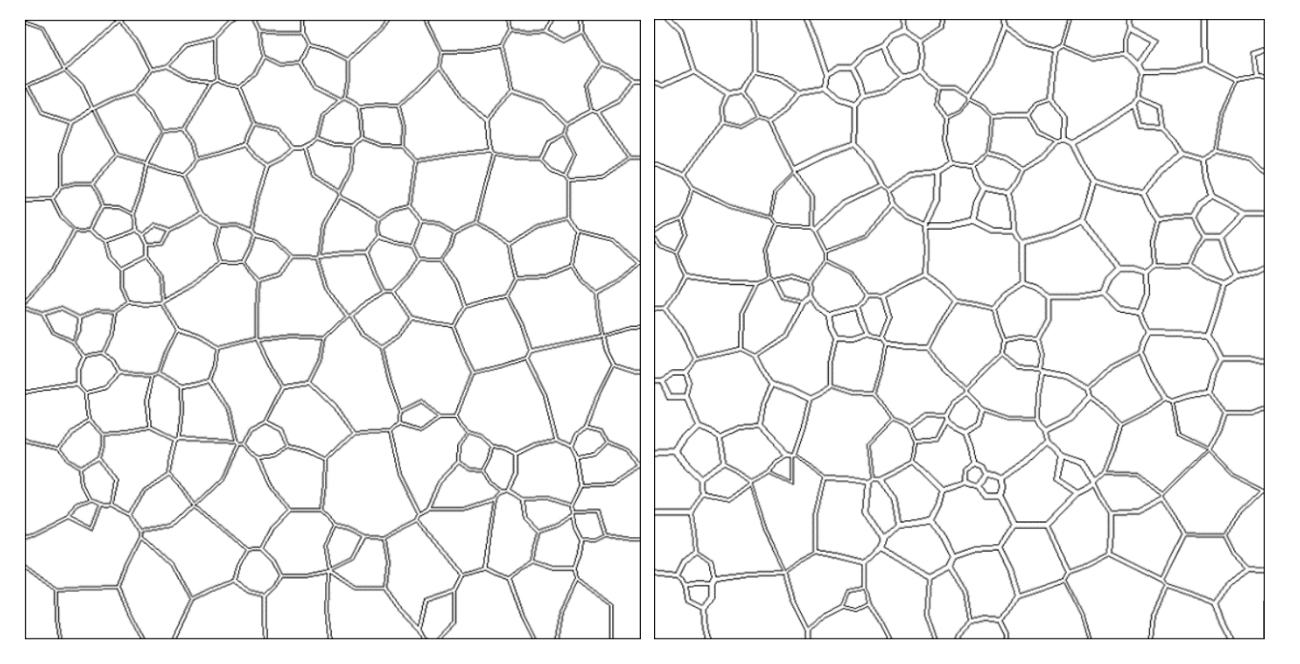 Преимуществом представленного алгоритма перед другими методами компьютерного моделирования поликристаллических материалов является возможность получения кусочно-линейных межзеренных границ разной толщины, величины которых могут не только быть заданы как различным законам статистического распределения, но и иметь одинаковую величину. При этом сами зерна могут иметь как выпуклую, так и вогнутую форму, которую невозможно получить, используя большинство других методов компьютерного моделирования.