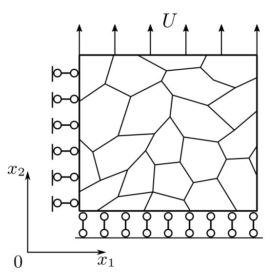 Полученные модели структурно-неоднородных сред можно использовать для решения краевых задач механики. Для этого в программном пакете конечно-элементного анализа ANSYS проводятся расчеты последовательных статических задач в условиях одноосного растяжения. Граничные условия в соответствии со схемой нагружения, представленной на рис. 9: фиксируются перемещения на нижней и левой гранях области деформирования, а на верхней грани задается некоторое перемещение $U$, вычисляемое заново на каждом шаге расчета.
