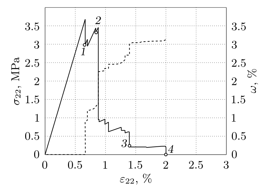 В качестве результатов численного моделирования тестовой задачи на рис. 10 приведены диаграмма деформирования и график накопления повреждений, на рис. 11 — картины структурных дефектов на различных стадиях нагружения.