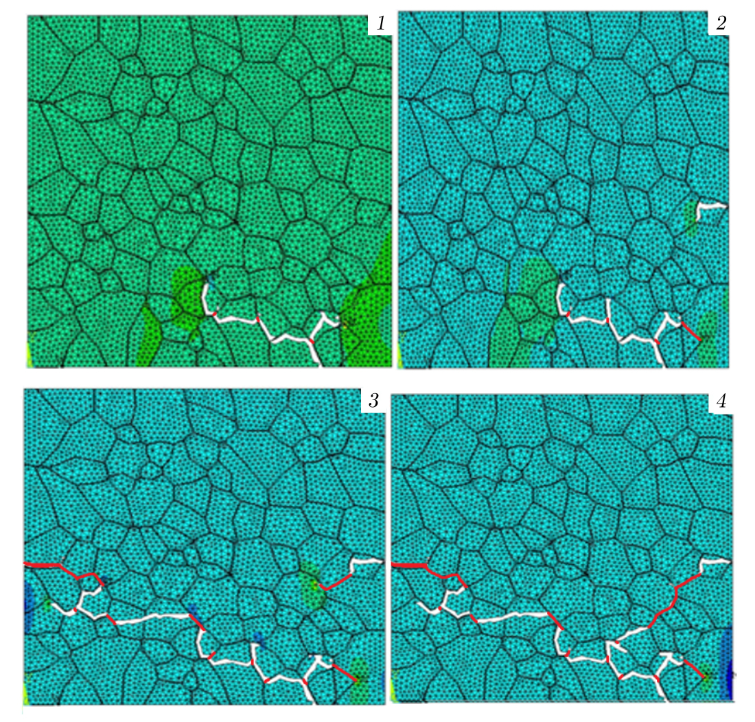 На рис. 11 приведены картины структурных дефектов для четырех значений деформаций, которые отмечены точками на диаграмме деформирования (см. рис. 10) и иллюстрируют развитие трещины в поликристаллическом модельном материале. На представленных картинах структурных дефектов видно, что в процессе деформирования разрушаются как конечные элементы зерен (закрашены белым цветом), так и конечные элементы межзеренных границ (закрашены красным цветом). На рисунках можно проследить влияние разрушения межзеренных границ на диаграмму деформирования. В частности, на рис. 10 между точками 2 и 3 имеется резкое снижение напряжений на величину порядка 70 % от максимального значения напряжений. Такое резкое снижение напряжений обусловлено в основном разрушением межзеренных границ. Другие, меньшие по величине, скачки напряжений на этом же участке соответствуют в основном разрушению отдельных зерен.