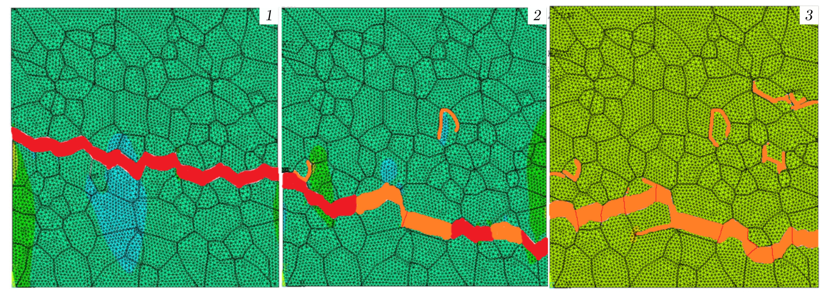 Рис. 12. Картины структурных дефектов при интеркристаллитном, транскристаллитном и смешанном режимах разрушения: 1) $\sigma_b/\langle\sigma_g\rangle=0.28$, 2) $\sigma_b/\langle\sigma_g\rangle=1$, 3) $\sigma_b/\langle\sigma_g\rangle=2.2$ (онлайн в цвете)