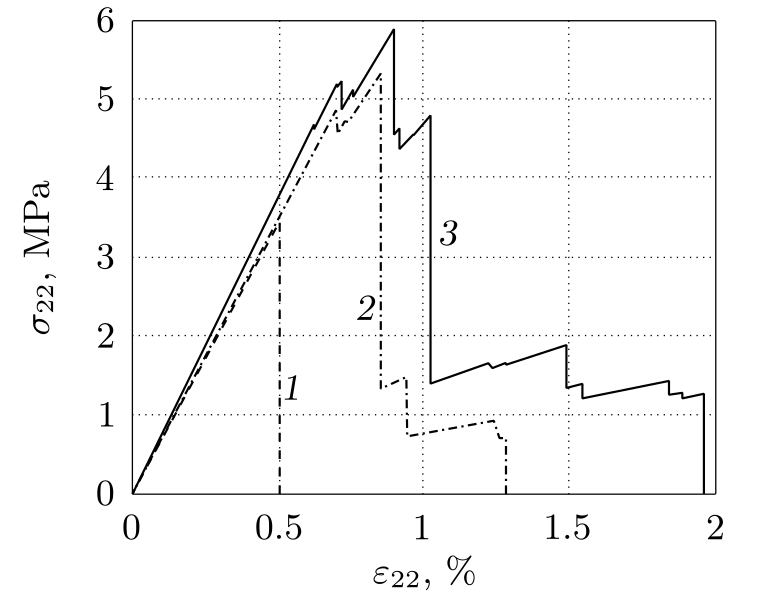 На начальном этапе, когда неизвестно необходимое удлинение для разрушения элемента с наименьшим запасом прочности, задается некоторое малое начальное удлинение $U$, при котором реализуется деформация не более 0.001 %. Это удлинение малой величины необходимо для расчета следующего шага удлинения $U'$, при котором разрушается конечный элемент с наименьшим запасом прочности. После его разрушения в модели происходит перераспределение напряжений, которое может привести к последующему разрушению других элементов. Итерационная процедура построена таким образом, чтобы на каждой итерации разрушался только один конечный элемент. Для реализации такой схемы разрушения конечных элементов использована процедура автоматического расчета шага нагружения. В этой процедуре вводится коэффициент $t$, который равен минимальному отношению предела прочности $i$-того конечного элемента к интенсивности напряжений: