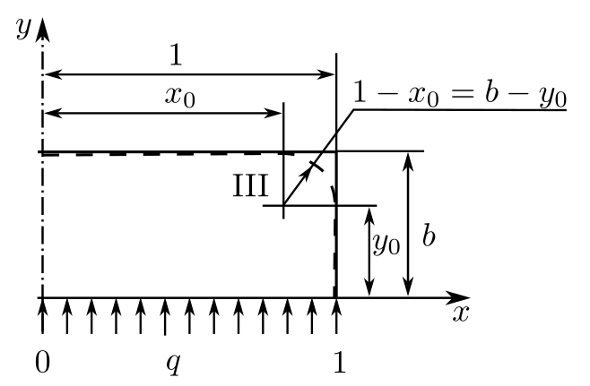 Деформирование мембраны в условиях ползучести рассматривается как последовательность трех стадий. На первой стадии мембрана деформируется в свободных условиях вплоть до касания поперечной стороны жесткой матрицы. На второй стадии она деформируется при касании поперечной стенки матрицы вплоть до касания ее продольных стенок. На третьей стадии она уже деформируется при одновременном касании продольных и поперечной стенок матрицы.