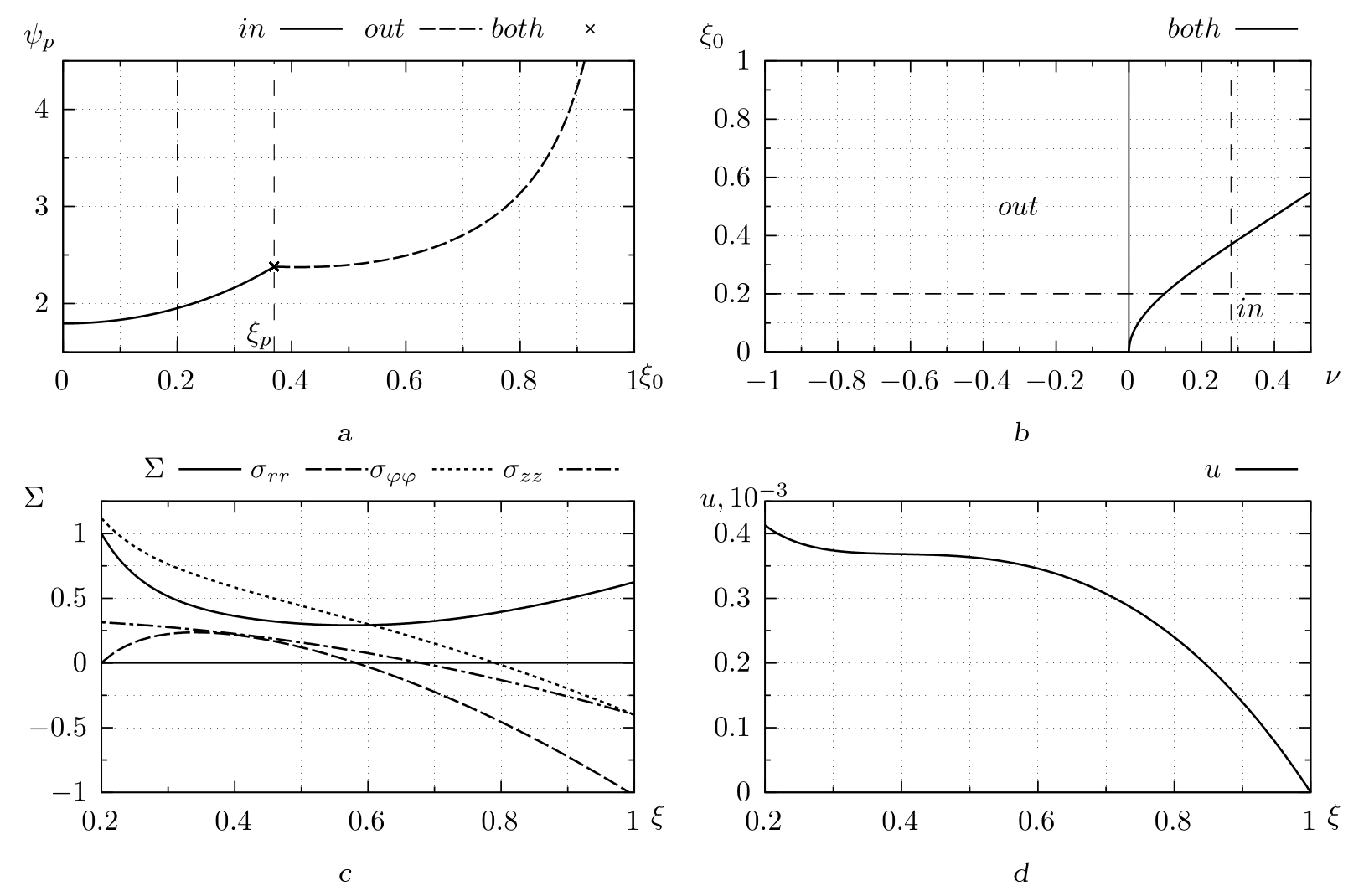 С ростом угловой скорости будут увеличиваться и напряжения, и в определенный момент времени они выйдут на поверхность нагружения (выполнится условие $\Sigma = 1$). Это приведет к появлению области вязкопластического течения наравне с областью упругого деформирования. Из приведенного условия и полученных напряжений (9) найдем соответствующее значение угловой скорости $\psi_p$. Полученная функция может иметь два локальных минимума при $\xi = \xi_0$ и $\xi = 1$. При некотором значении $\xi_0 = \xi_p$ значения параметра нагружения в этих двух точках совпадают, то есть пластическое течение начинается одновременно на внутренней и боковой поверхностях. При меньших значениях $\xi_0 < \xi_p$ пластическое течение впервые начинается на внутренней поверхности ($\xi = \xi_0$), при больших $\xi_0 > \xi_p$ — на боковой ($\xi = 1$):