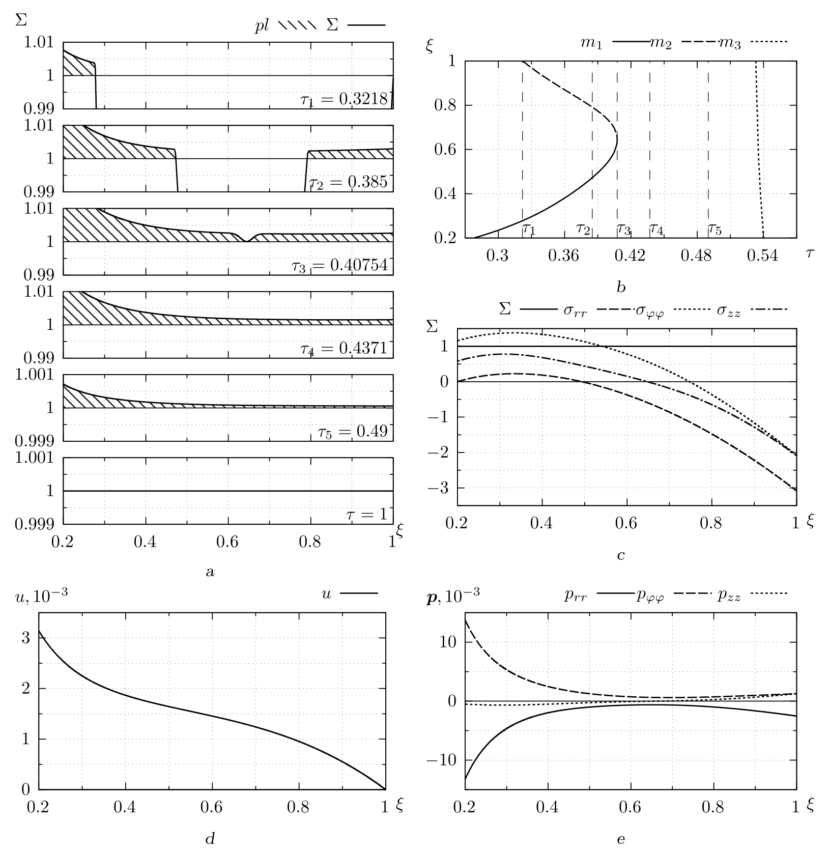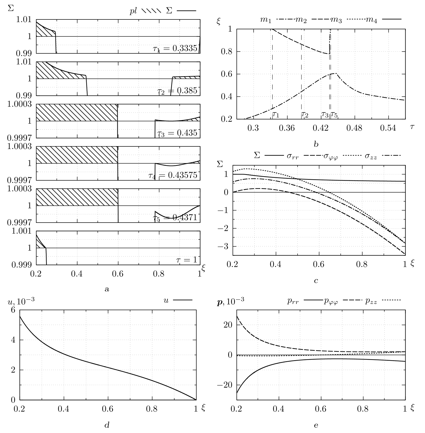 Приведенные на рис. 2 результаты расчетов показывают следующее. Пластическое течение начинается у внутренней полости $\xi = \xi_0$, затем у боковой поверхности $\xi = 1$. При увеличении скорости вращения границы этих областей $\xi = m_1(\tau)$ и $\xi = m_2(\tau)$ движутся навстречу друг другу и в определенный момент эти области объединяются в одну. При достижении угловой скоростью фиксированного значения $\psi(\tau) = 3.2$ уровень напряжений сокращается (уменьшается величина разницы $\Sigma - 1$), что приводит к сокращению скоростей пластического течения вплоть до нуля. Хотя это и происходит практически одновременно, все же можно заметить, что скорости пластического течения сначала обращаются в нуль у боковой поверхности $\xi = 1$, а затем граница обнуления скоростей пластического течения $\xi = m_3(\tau)$ быстро продвигается в направлении внутренней полости $\xi = \xi_0$. Когда $m_3$ становится равным $\xi_0$, пластическое течение в среде полностью останавливается.