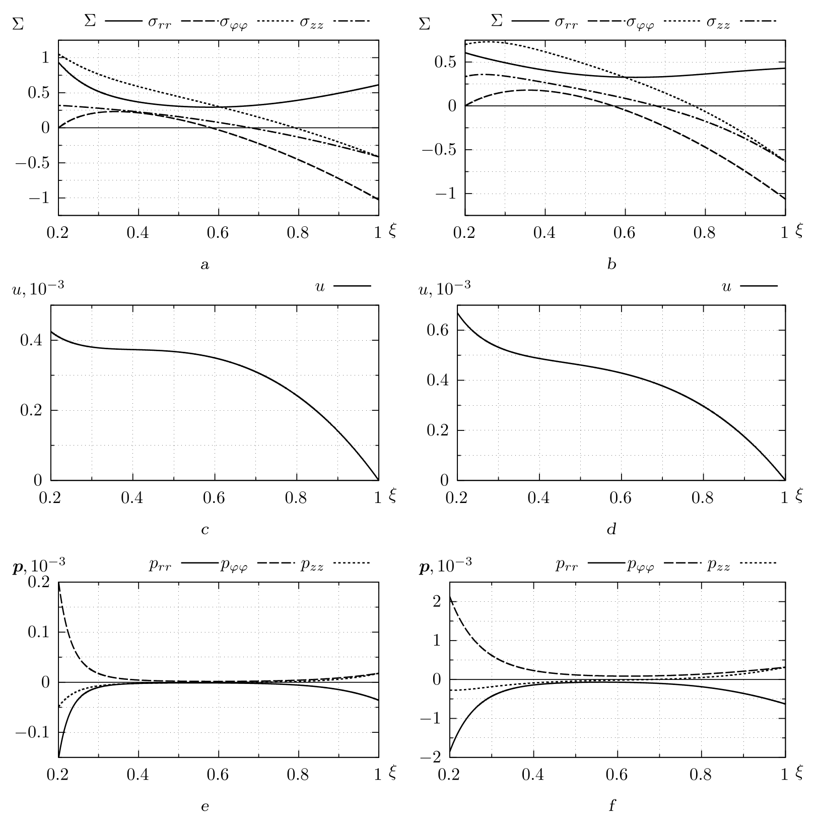 Используя полученные соотношения (15), (16), можно найти распределения перемещений и напряжений в материале цилиндра в заданный момент времени при известных значениях угловой скорости $\psi(\tau)$ и накопленных необратимых деформациях $\boldsymbol{p}$, а с помощью соотношений (11) — прирост необратимых деформаций на следующем временном шаге. При расчетах принимаем, что коэффициент вязкости $\zeta = 0.1$, а угловая скорость