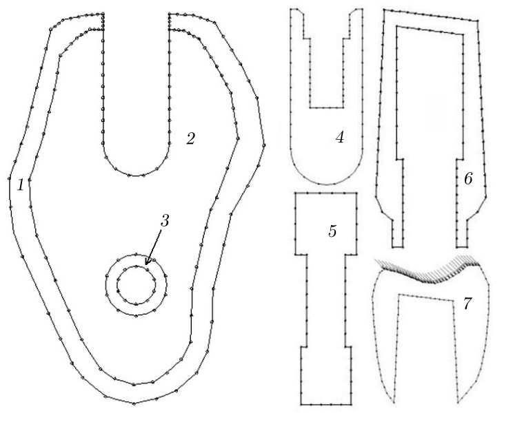 Рис. 2. Дискретизация границ подобластей имплантата и костных тканей; действие наклонной нагрузки; 7 подобластей; 1106 узлов во всей модели