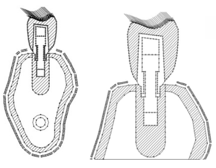 Исследование зависимости интенсивности напряжений от плотности кортикальной и губчатой костных тканей выполнено посредством параметрической вариации модулей упругости соответствующих костных тканей для модели соединения цилиндрического имплантата и костных тканей при действии нормальной и наклонной нагрузок. Полученные результаты качественно (ввиду различия геометрических параметров моделей и механических свойств) согласуются с результатами работ [3, 8, 11].