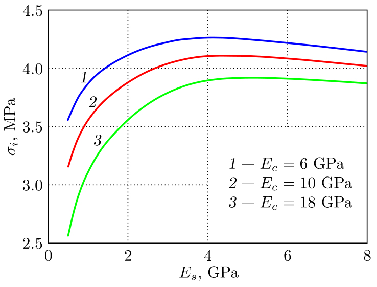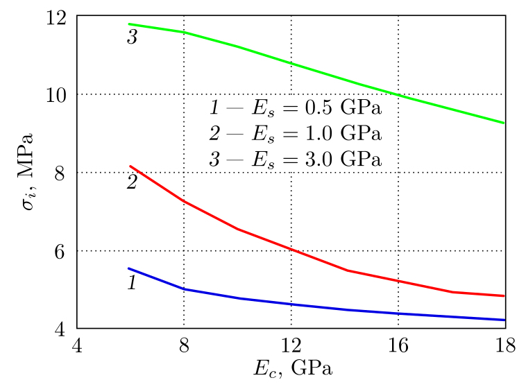 Увеличение модуля упругости губчатой костной ткани $E_s$ приводит к возрастанию максимальных напряжений в губчатой кости, причем рост напряжений происходит более интенсивно, чем при нормальной нагрузке, см. рис. 3 и 8. Отметим, что при наклонной нагрузке и малых значениях модуля упругости губчатой кости ($E_s<2$ МПа) изменение напряжений в кортикальной кости слабо зависит от модуля упругости кортикальной костной ткани (см. рис. 4 и 9). Напряжения в губчатой кости снижаются при увеличении модуля упругости кортикальной кости $E_c$, см. рис. 8 и 10. При этом значения максимальных напряжений значительно (примерно в три раза) превышают соответствующие значения при нормальной нагрузке (см. рис. 3, 5 и рис. 8, 10), что связано с действием изгибающего момента. Уровень напряжений в кортикальной кости возрастает при увеличении модуля упругости этой кости, (см. рис. 9 и 11). Для максимальных напряжений в кортикальной кости при наклонной нагрузке отличия от случая нормальной нагрузки невелики (см. рис. 4, 6 и рис. 9, 11), что связано с меньшей величиной механического момента $M_1$ в слое кортикальной кости.
