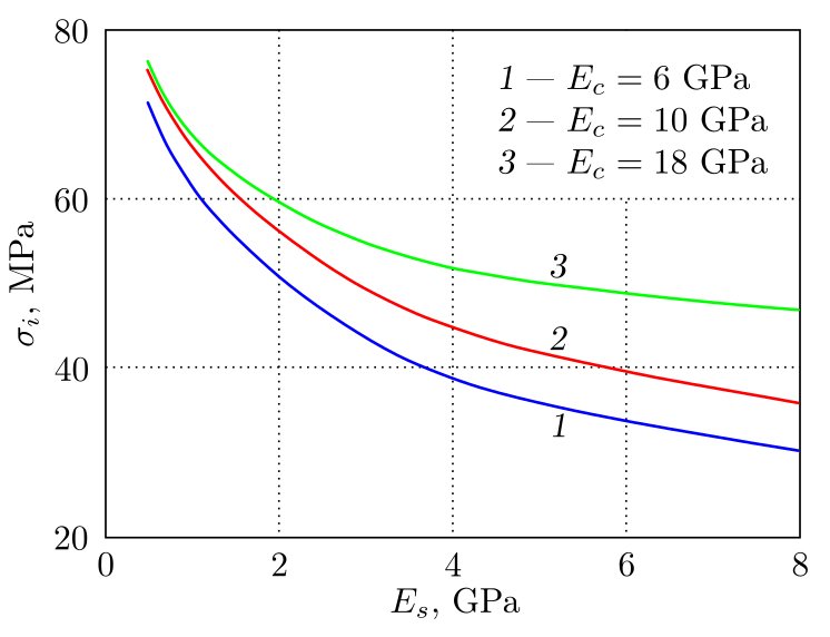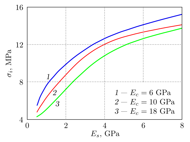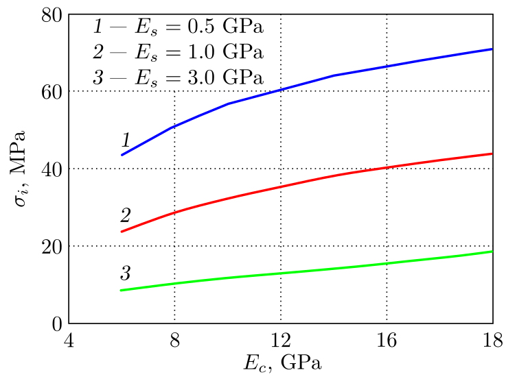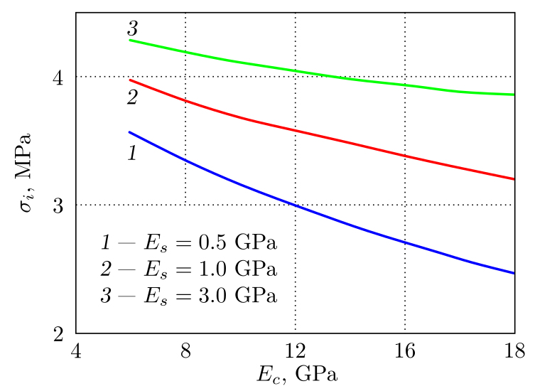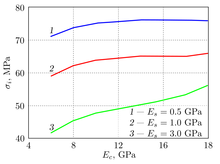 - для каждого из трех значений модуля упругости губчатой кости ${E_s} = \{0.5; 1; 3\}$ ГПа выполнялся расчет при различных значениях модуля упругости кортикальной кости ${E_c} = \{6; 8; 10; 14; 18; 20\}$ ГПа.