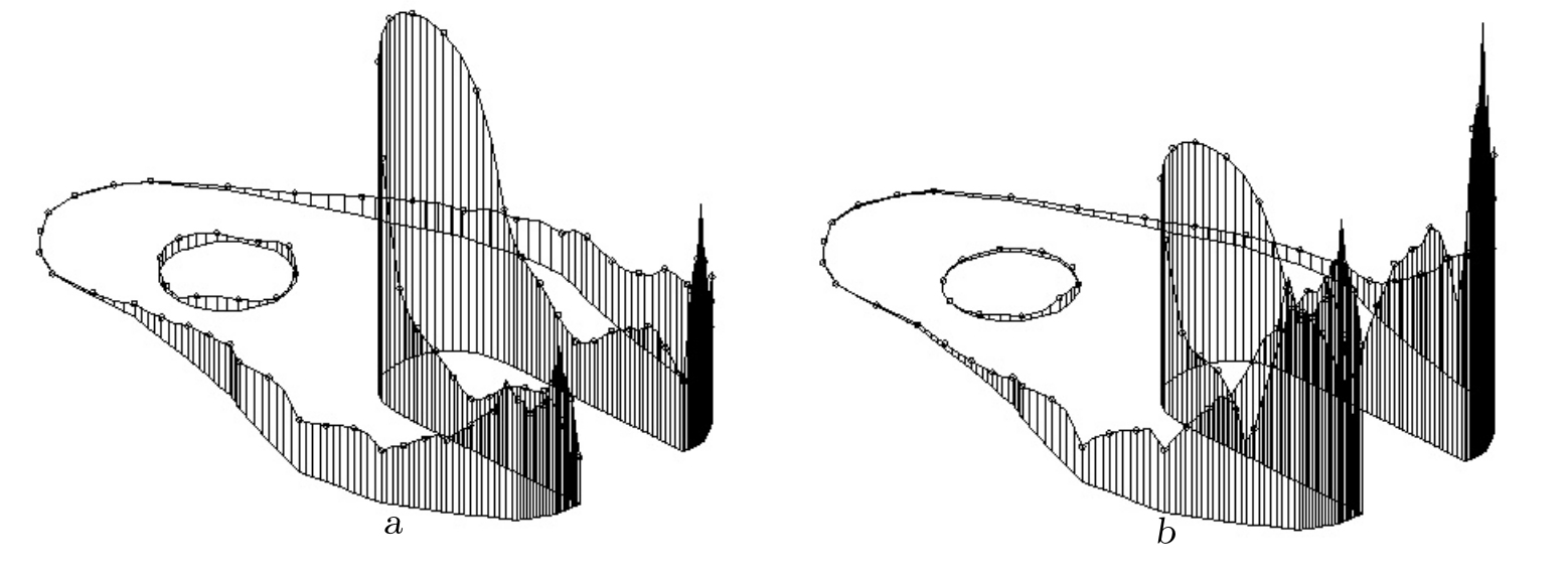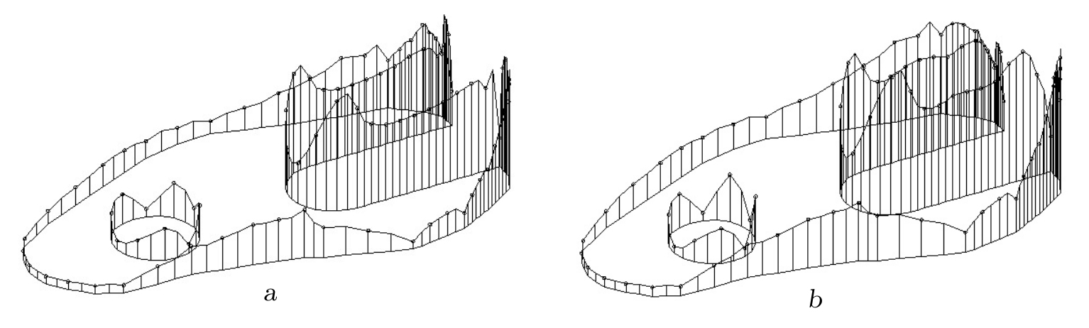 На рис. 7 представлены распределения интенсивности напряжений по границе губчатой кости для двух значений модуля упругости кортикальной кости. При малом значении модуля упругости губчатой кости максимум напряжений наблюдается вблизи зоны контакта губчатой и кортикальной костных тканей с имплантатом (шейка имплантата, см. рис. 1, подобласти 1 и 2, верхняя часть), а при увеличении модуля упругости губчатой кости положение максимума смещается в нижнюю зону контакта между имплантатом и губчатой костью. Отметим, что ввиду несимметрии коронки и возникновения в связи с этим изгибающего момента распределение напряжений при нормальной нагрузке не является симметричными.