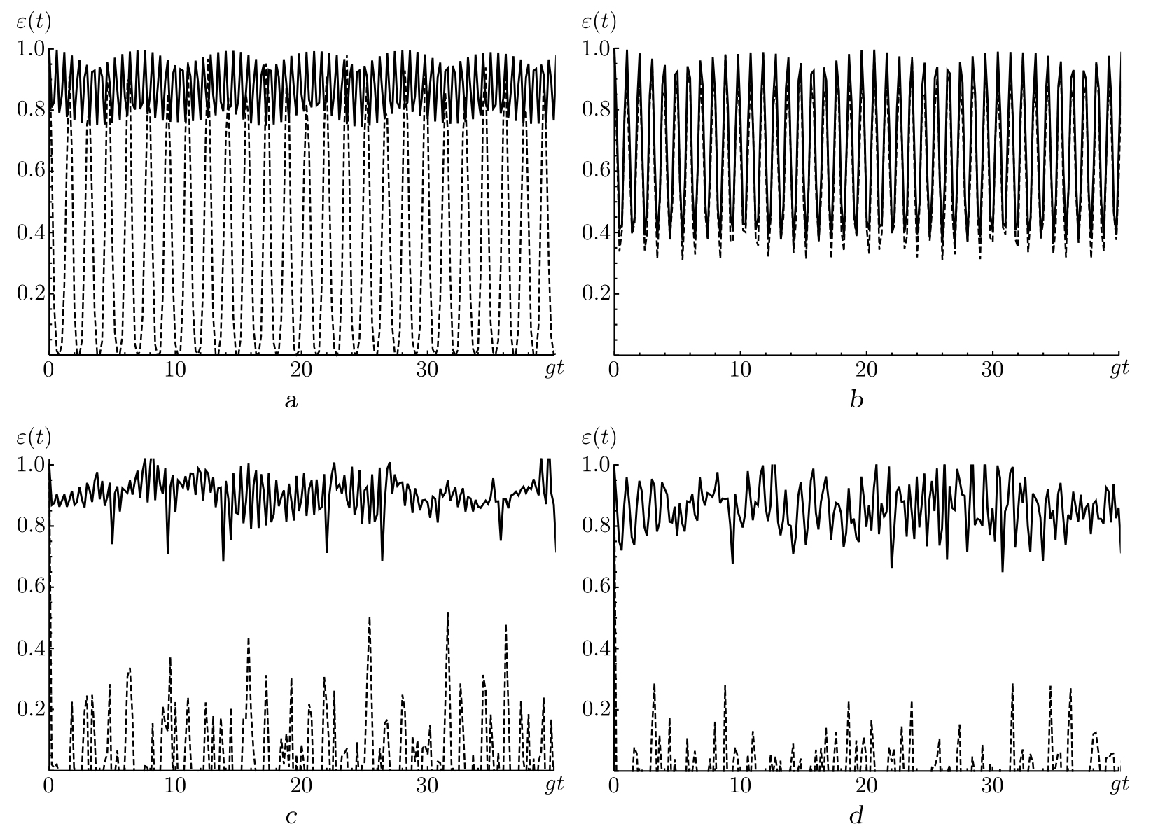 Результаты численного моделирования отрицательности (20) и (21) представлены на рис. 1 и 2. На рис. 1 показана временная зависимость отрицательности (20) для начального перепутывания кубитов (2) и различных значений расстройки и среднего числа тепловых фотонов в моде резонатора. На рисунках сплошные линии показывают поведение параметра перепутывания для резонаторов со средой Керра, а штриховые линии соответствуют модели в отсутствие керровской нелинейности. При этом представлено поведение отрицательности как для слабого теплового поля (a, b), так и для интенсивного теплового поля резонатора (c, d). Наконец, представлено поведение параметра перепутывания как для резонансного (a, c), так и для нерезонансного взаимодействия кубитов с тепловым полем (b, d). Из рисунков видно, что для слабых тепловых полей нет эффекта мгновенной смерти перепутывания как в отсутствие, так и в присутствии керровской нелинейности.