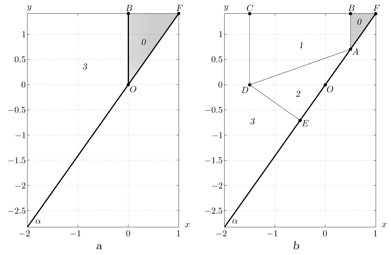 Рассмотрим политропный газ, покоящийся в клиновидной области $BOF$ плоскости $xOy$ (выделено серым цветом и отмечено цифрой 0 на рис. 1, a), образованной двумя непроницаемыми стенками $OB$ и $OF$. Полубесконечная вертикальная стенка $OB$ задается уравнением $x=0$ (при $y\geqslant 0$). Бесконечная косая стенка $OF$ задается уравнением $y = x \operatorname{tg} \alpha$. Линия $BF$ не является непроницаемой стенкой, поэтому на ней никакие условия на газ не накладываются. Часть плоскости $xOy$ слева от вертикальной стенки $OB$ и выше косой стенки $OF$ — вакуум (отмечено цифрой 3 на рис. 1, a).