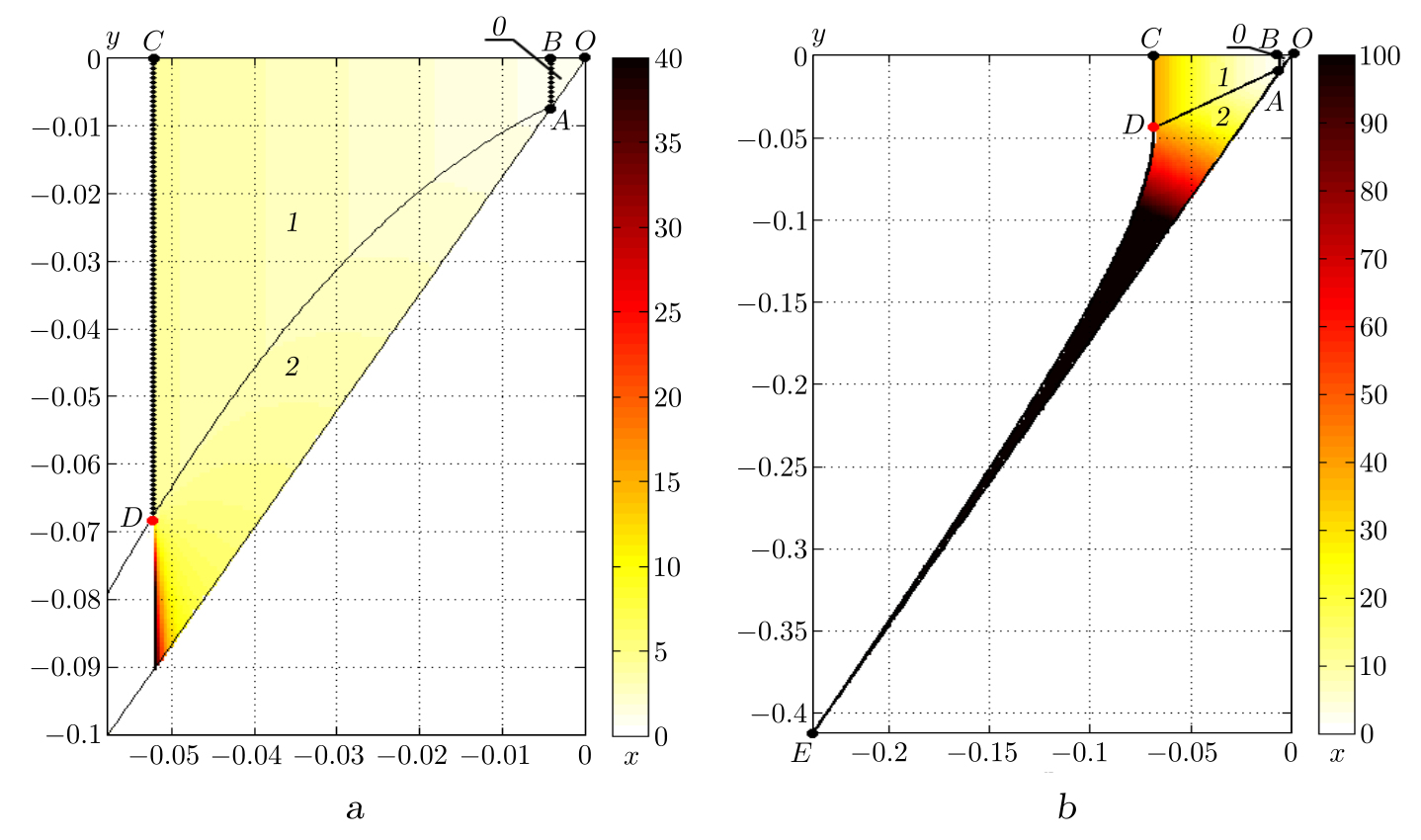 В области $ADE$, помеченной на рис. 1, b цифрой 2, находится двойная волна — искомое двумерное течение. Это течение отделено от центрированной волны звуковой характеристикой $C^+$ — линия $AD$. Область двойной волны примыкает к вакууму через свободную границу — линия $DE$. Стенка $AE$ является непроницаемой, поэтому на этой стенке выполняется условие непротекания: