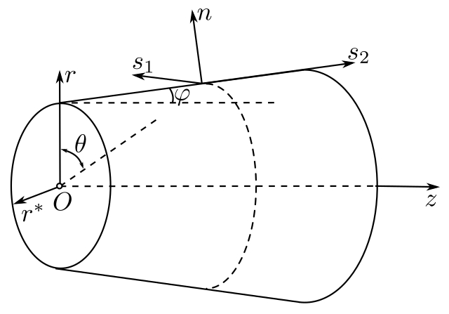 Для задания граничных условий на конической поверхности стержня в произвольной точке его поверхности введем ортогональную систему координат $(n, s_{1},s_{2})$ (см. рис. 1). Здесь $n$ — нормаль к поверхности оболочки; $s_{1}$, $s_{2}$ — ортогональные к нормали координаты в плоскости образующей стержня, проведенной к его поверхности в выбранной точке. При этом $s_{1}$ направлена в окружном направлении, а $s_{2}$ — в продольном. Касательные напряжения $\tau_{ns_{1}}$ и $\tau_{ns_{2} }$ в точках конической поверхности в ортогональной системе координат $(n, s_{1}, s_{2})$ выражаются через компоненты напряжений в цилиндрической системе координат $(r, \theta, z)$. Cчитается [6, 7], что крутильные колебания стержня возбуждаются внешним динамическим усилием $f_{ns_{1}}(z,t)$, действующим на поверхности стержня, т.е. граничное условие задачи в системе координат $(n,s_{1},s_{2})$ при $r=r_{0} +kz$ имеет вид