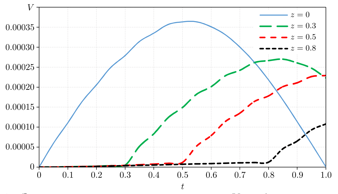 На рис. 2 приведены расчетные зависимости крутильного перемещения $V$ от безразмерного времени в различных поперечных сечениях стержня. Из представленных графиков видно, что колебания начинаются в тот момент, когда волна достигает того или иного сечения. Самые большие изменения претерпевают перемещения точек левого торца стержня, имея максимальное отклонение, равное 0.00036 при $t=0.5$. При этом чем дальше сечение от левого, подвергнутого кинематическому воздействию торца, тем меньше максимальное значение перемещения. Например, максимальные значения перемещений точек сечений $z=0$ и $z=0.3$ отличаются друг от друга на 33.3 %. Зависимости перемещения носят синусоидальный характер и являются затухающими при возрастании продольной координаты.