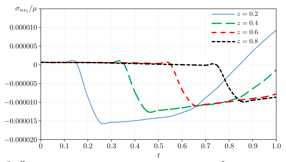 Рис. 5. Зависимость касательного напряжения \(\sigma_{ns_1}\) от продольной координаты \(z\) в различные моменты безразмерного времени \(t\) для усеченного конического стержня