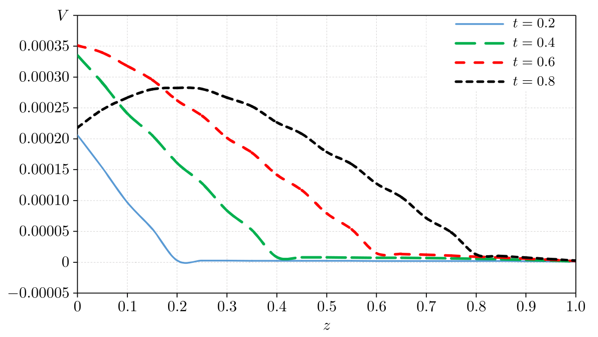 На рис. 4 приведены графики зависимости крутильного перемещения $V$ от продольной координаты $z$ усеченного конического стержня в различные моменты безразмерного времени $t$. В сечении $z=0$ при значениях времени $t\leqslant 0.6$ перемещения поверхностных точек достигают своего максимального значения и тут же начинают затухать, а к концу конического стержня во всех зафиксированных значениях времени ($t=0.2;\, 0.4;\, 0.6;\, 0.8$) уже полностью затухают.