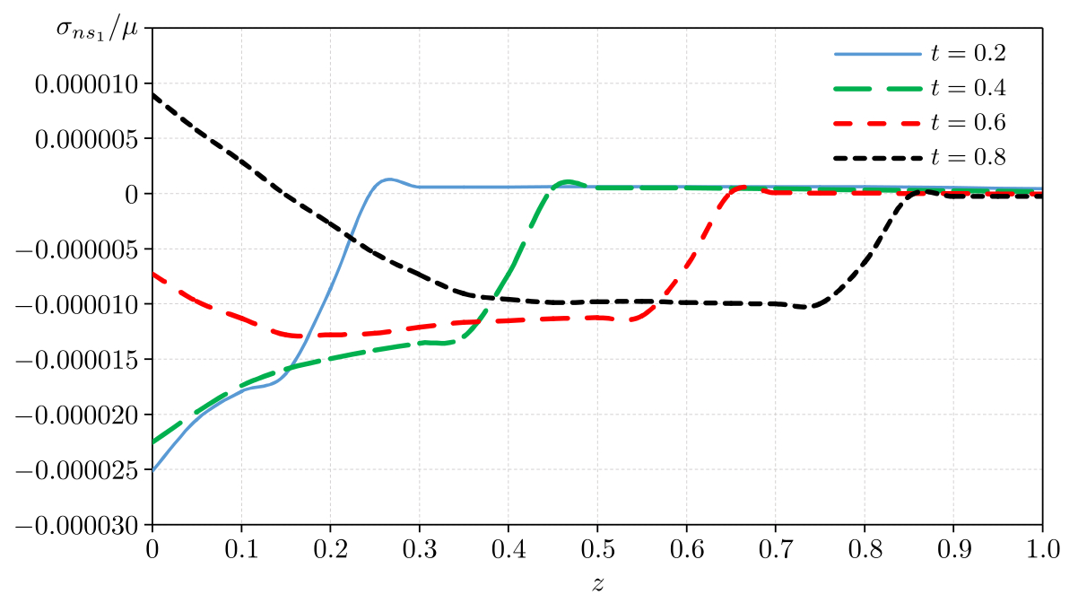 [Figure 5. The tangential stress ${\sigma }_{ns_1}$ vs. longitudinal coordinate $z$ graph at various moments of dimensionless time $t$ for a truncated conical rod]