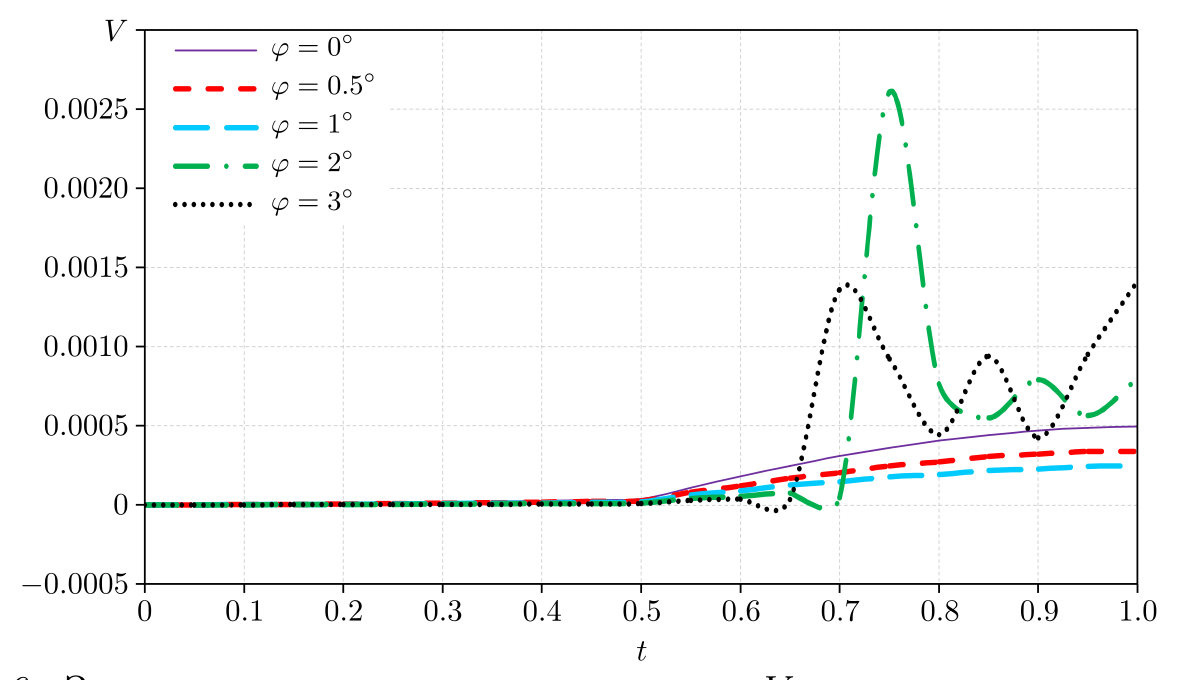 На рис. 6 приведены графики изменения крутильного перемещения точек срединного сечения стержня по безразмерному времени $t$ при различных значениях угла атаки $\varphi$. Из графиков видно, что при значениях угла атаки $0\leqslant \varphi <2^{\circ }$ перемещение $V$ точек срединного сечения стержня начинает расти с момента достижения возбуждением сечения $z=0.5$; полученные графики можно считать относительно плавными. При этом малым значениям угла атаки соответствуют большие значения перемещения, т.е. с ростом значения угла атаки перемещения уменьшаются.