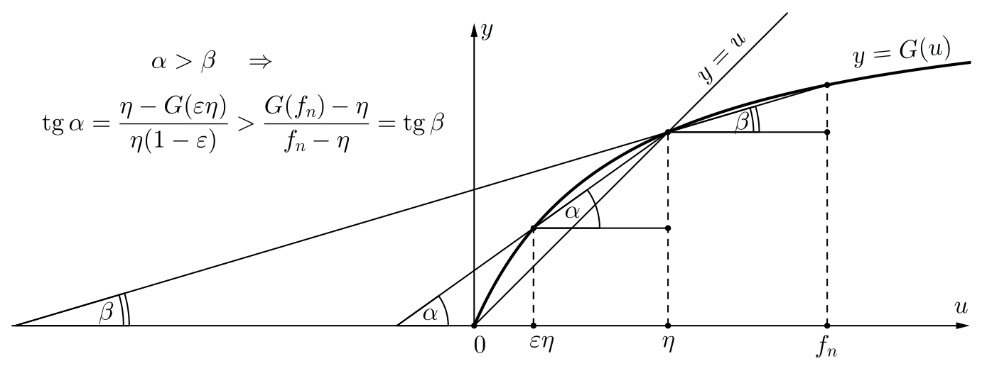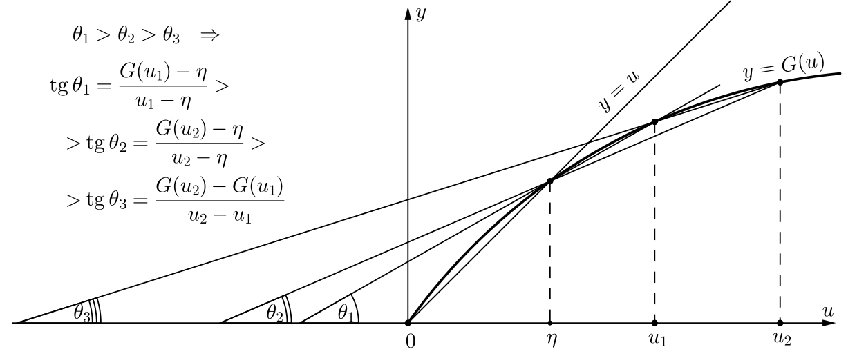 Очевидно, что $\rho:=\displaystyle\frac{\eta-G(\varepsilon\eta)}{\eta(1-\varepsilon)}\in(0, 1)$, ибо $G(\varepsilon\eta)>\varepsilon\eta,$ $G(\eta)=\eta,$ $y=G(u) \uparrow$ на $\mathbb{R}^+$ и $y=G(u)$ выпукла вверх на $\mathbb{R}^+$.