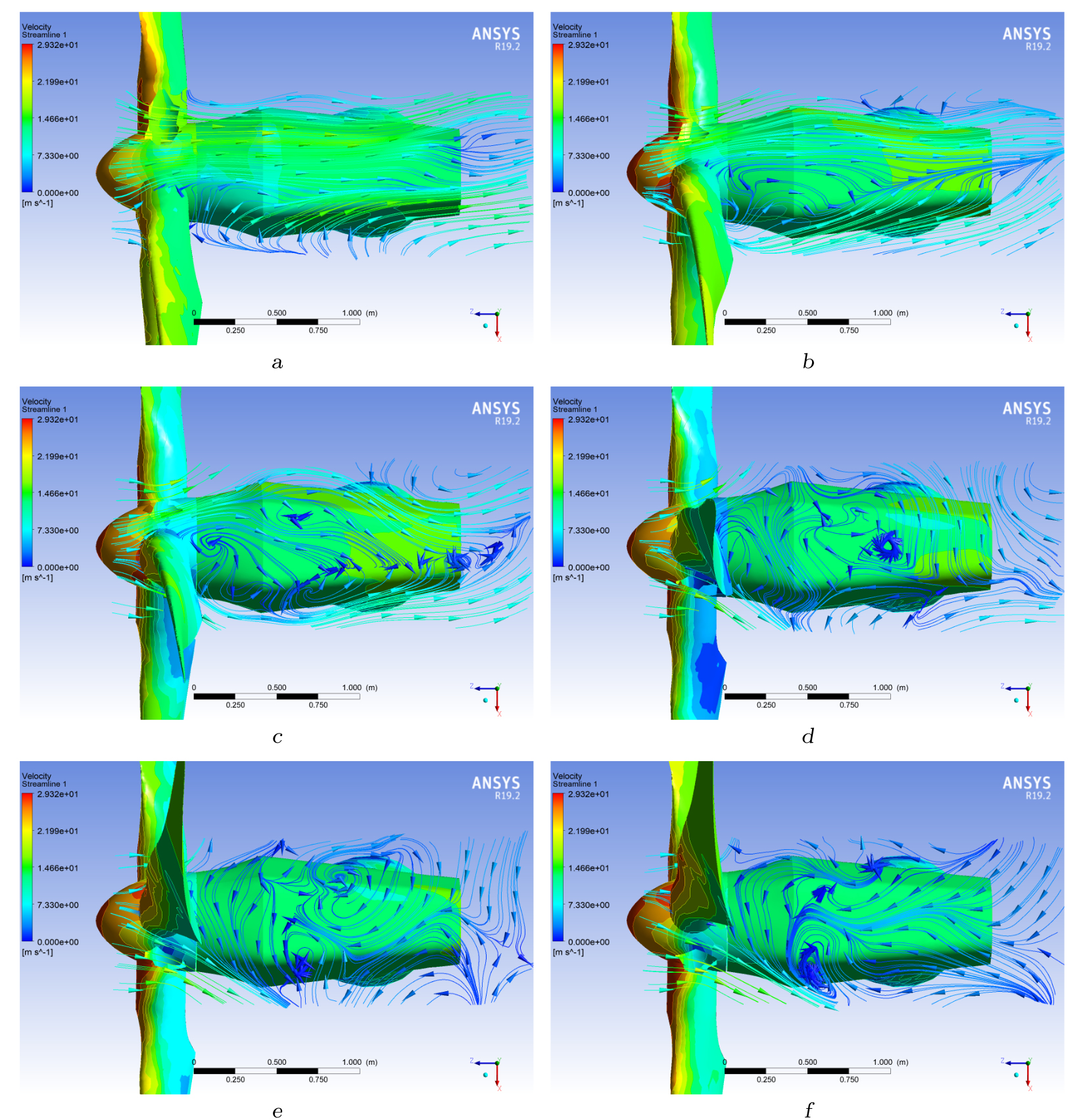 Рис. 1. Вид сверху на гондолу при моделировании потока: a — положение 1; b — положение 2; c — положение 3; d — положение 4; e — положение 5; f — положение 6