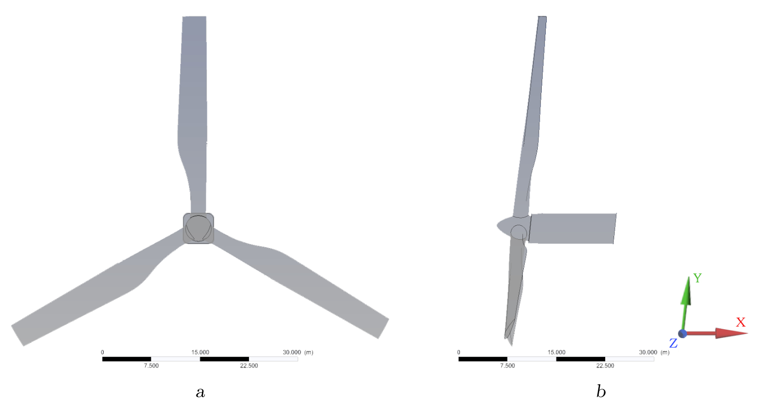 [Figure 2. 3D model of the wind turbine: a — Front view; b — Side view]