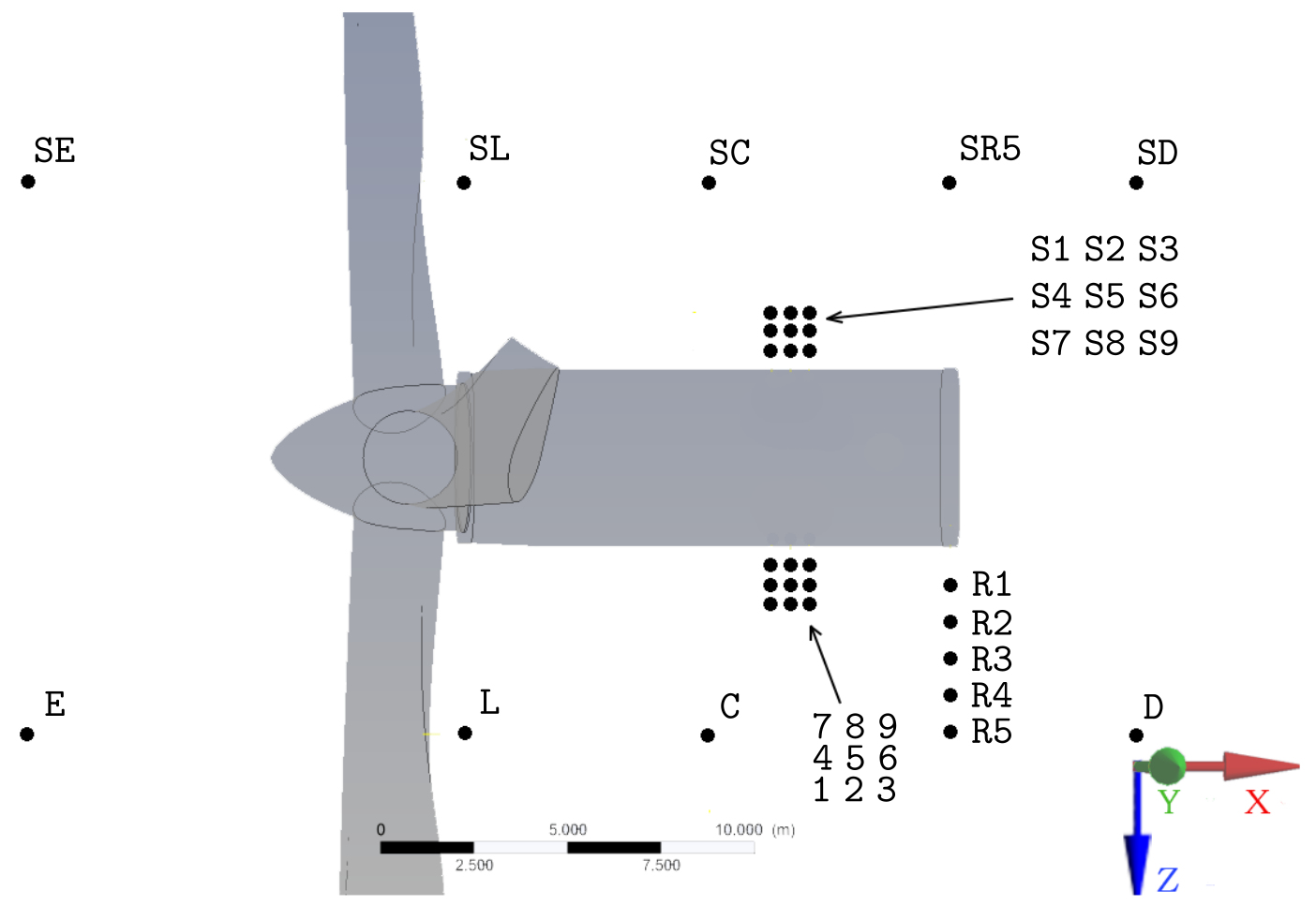 Покоординатное размещение исследуемых точек на высоте средней горизонтальной линии гондолы представлено на рис. 3. Это расположение обусловлено необходимостью избежать влияния краевых эффектов верхней и нижней частей. Ветер набегает с левой стороны под определенным углом $\alpha$. Большинство точек в нижней части рис. 3 имеет зеркальные копии в верхней части. Оценочные точки E (estimated) и SE (specular estimated) взяты для проверки правильности выставленного угла направления на ветер. Например, если в расчетном случае назначен определенный угол направления на ветер, то в указанных точках будет точно такая же величина. В других точках значения явно будут отличаться. Левые по отношению к положению гондолы точки L и SL должны показать высокий уровень колебаний ветрового потока для оценки верхней границы возмущения потока. Точки C, SC, R5, SR5, D и SD (центральные, правые и диагональные) являются теоретически пригодными для размещения прибора и приняты для рассмотрения в них характера течения. Первые четыре удалены на 5 м от стенок гондолы. Точки R1–R5 нужны для проведения анализа изменчивости движения ветрового потока по мере отдаления от стенки. Каждая из этой группы имеет шаг в 1 м. Наиболее вероятными для размещения прибора являются точки 5 и S5. В них исключается проблема с большой длиной опорного штока, характерная для ранее описанных точек.