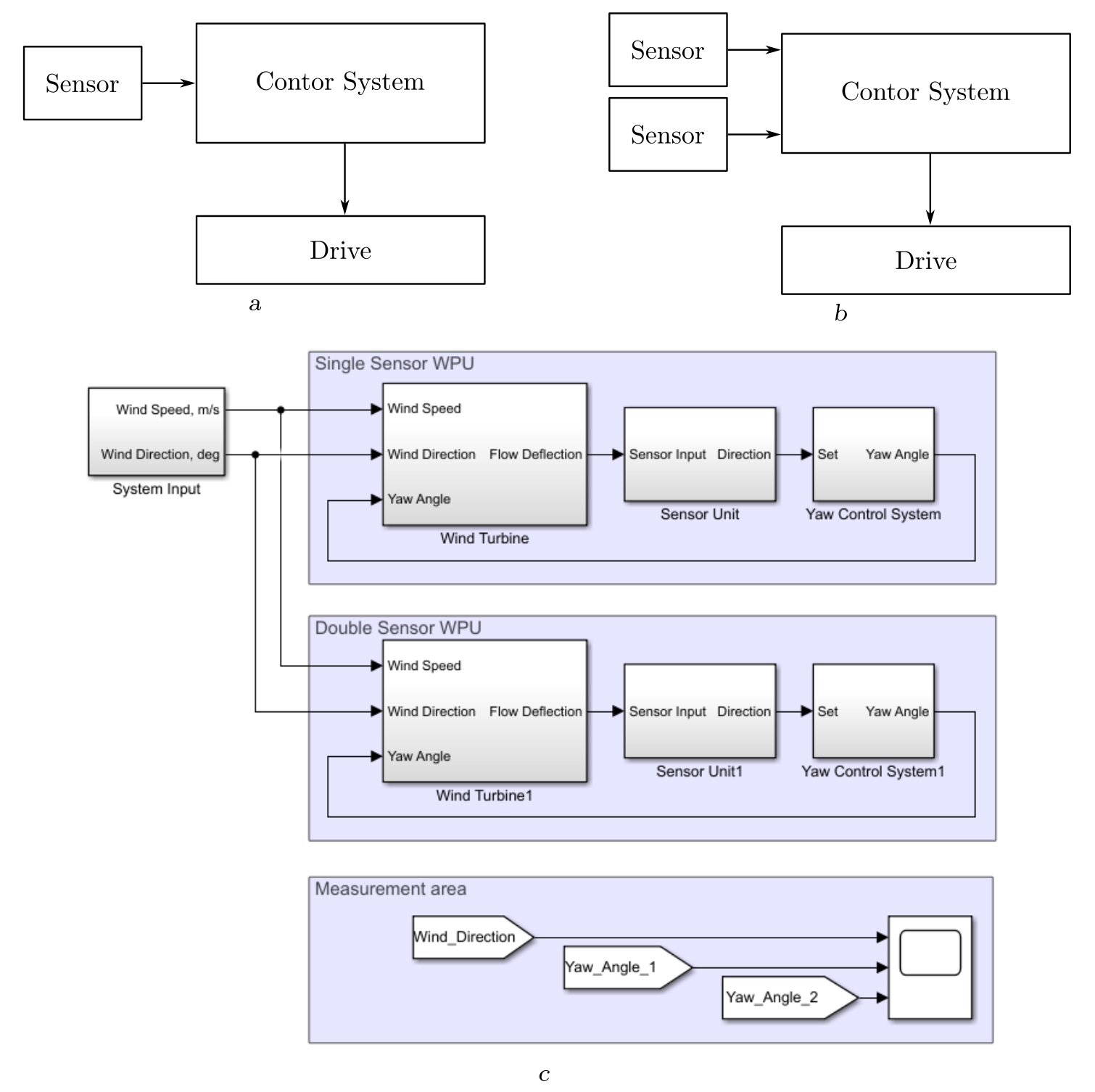 Рис. 6. Моделирование в Matlab/Simulink: a — схема систем управления ориентации на ветер с одним датчиком направления; b — схема систем управления ориентации на ветер с двумя датчиками направления; c — блок-диаграмма имитационной модели ВЭУ в среде Matlab/Simulink