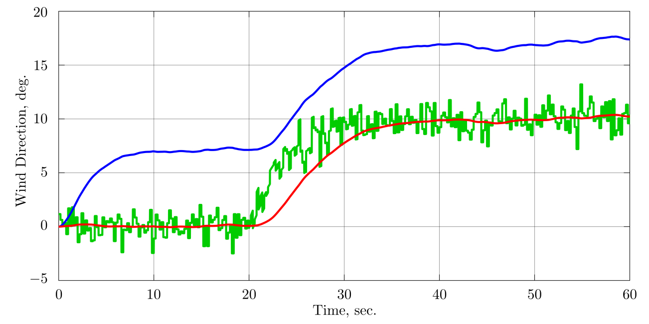 На рис. 7 зеленым цветом показан входной сигнал, соответствующий направлению ветра. Сигнал формирует входное воздействие в виде направления ветра, в начальный момент времени равного значению 0$^\circ$ в глобальной системе координат. После этого начиная с 20 по 30 секунду направление ветра меняется с угла 0 до 10$^\circ$, после чего до конца моделируемого временного интервала сохраняет это значение. Для большего соответствия реальной картине в сигнал добавлена случайная компонента.