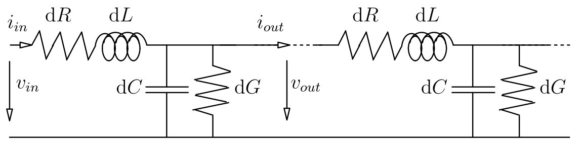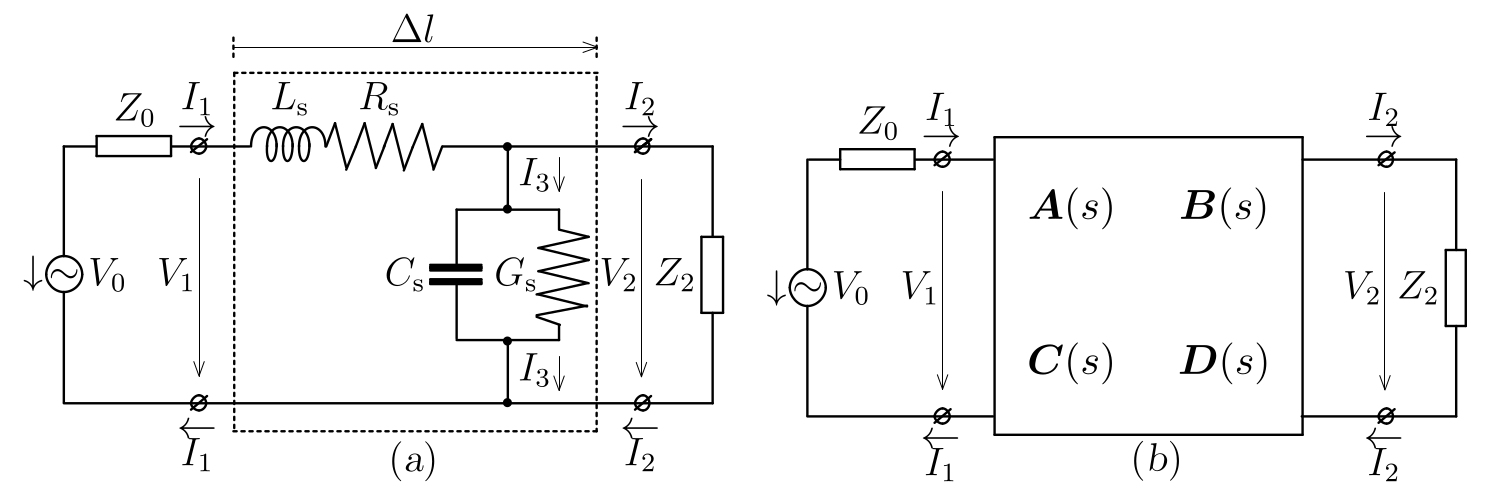 \[ \begin{equation} \left.\begin{aligned} \left[ \begin{array}{c} V_{1} \\ I_{1} \end{array} \right] & = \left[\begin{array}{c@{\quad}c} \boldsymbol{A}(s) & \boldsymbol{B}(s)\\ \boldsymbol{C}(s) & \boldsymbol{D}(s) \end{array} \right] \left[ \begin{array}{c} V_{2} \\ I_{2} \end{array} \right] ,\\ \boldsymbol{A}(s) &\triangleq 1 + F_\mathrm{s} (s); \,\, [\boldsymbol{A}(s)] = 1 ,\\ F_\mathrm{s} (s) &\triangleq (R_\mathrm{s}+sL_\mathrm{s})(G_\mathrm{s}+sC_\mathrm{s}); \,\, [F_\mathrm{s} (s)] = 1 ,\\ \boldsymbol{B}(s) &\triangleq (R_\mathrm{s}+sL_\mathrm{s}); \,\, [\boldsymbol{B}(s)] = \Omega ,\\ \boldsymbol{C}(s) &\triangleq (G_\mathrm{s}+sC_\mathrm{s}); \,\, [\boldsymbol{C}(s)] = {\mathrm S} \equiv {\Omega}^{-1} ,\\ \boldsymbol{D}(s) &\triangleq 1 .\end{aligned} \, \right\} \end{equation} \tag{1} \]
