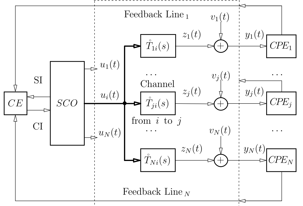 Figure 3. The distributed MIMO channel estimation structure. Legend: CE – Channel Estimation; SCO – System Central Office; SI – System Information; CI – Channel Information; CPE – Customer Premises Equipment; \(N\) – the number of customers, \(j=1,2,\ldots,N\)