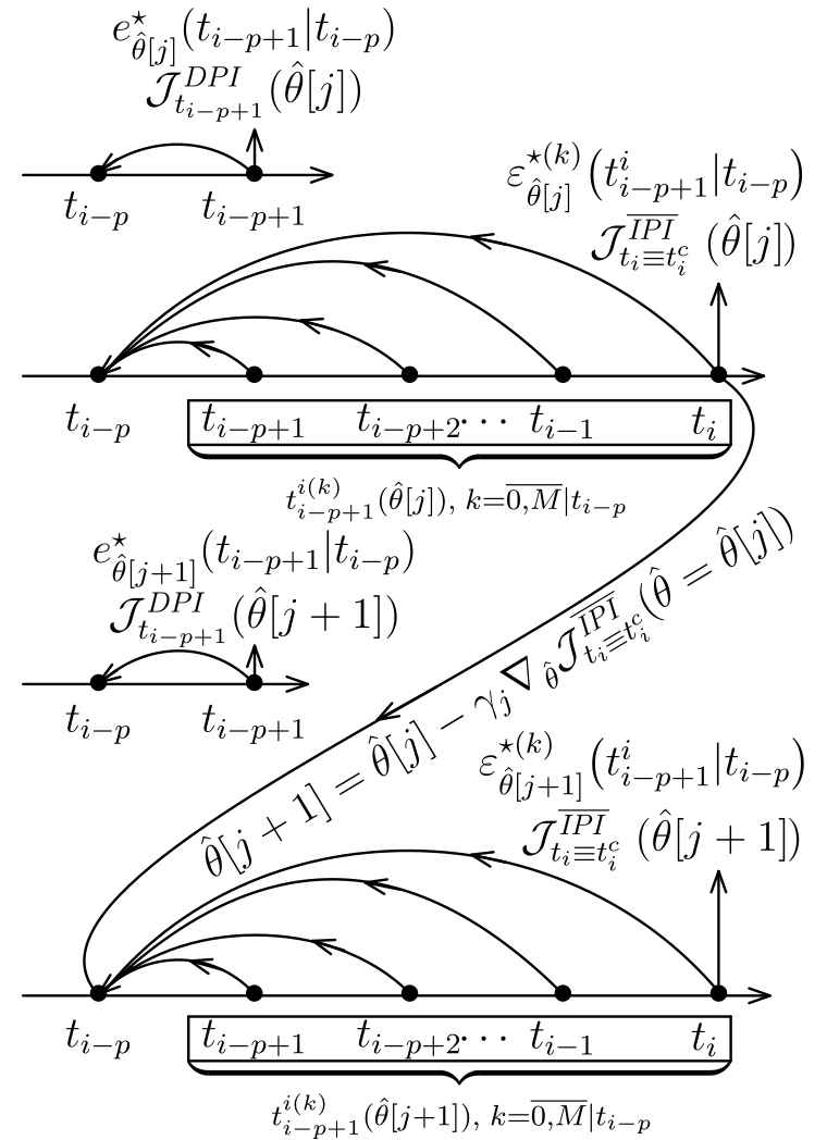 can be a reasonable alternative to (50) with a lower computational burden. It uses a small enough step size \(\gamma_{j} \in \mathbb{R} _{+}\) to guarantee \(f_{M}\bigl(\hat{\theta} = \hat{\theta}[j+1]\bigr) < f_{M}\bigl(\hat{\theta} = \hat{\theta}[j]\bigr)\) and thereby performs the transition to the next \(\operatorname{SOKF} (\hat\theta[j+1])\), as shown in Fig 4. and mentioned in Subsec. 4.5 to test candidate models sequentially. In this figure, the arcs directed by arrows from points \(t_{i-p+1}\), \(t_{i-p+2}\), and \(t_{i}\) to \(t_{i-p}\) on the horizontal line tell us, cf. (31), that all predictors \(g_j^{\star(k)}(t_{i-p+h}|t_{i-p})\), their numbers \(h= {1,2,\dots,p}\), involved in obtaining the estimates \(\hat y_{\hat\theta[j]}^{(k)}{\left( t_{i-p+h}|t_{i-p} \right)} = \mathring{H}_{\star} g_j^{\star(k)}(t_{i-p+h}|t_{i-p})\) are conditioned, in the probabilistic sense, on the entire measurement history \( y \bigl( t_{i-p-l}^{i-p} \bigr) \triangleq \bigl\{ y(t_{i-p-l}), y(t_{i-p-(l-1)}), \dots, y(t_{i-p-1}), y(t_{i-p}) \bigr\}, \) (theoretically, \(l \to \infty\)) which is incorporated in the predictors and precedes their calculation immediately after time \(t_{i-p}\).