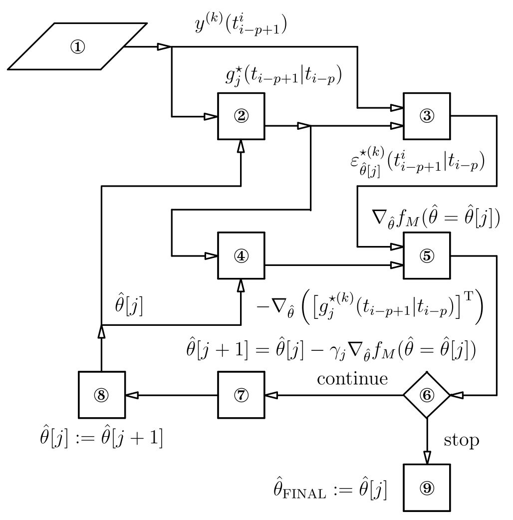 The identification procedure will continue repeating operations numbered (Fig. 5) by blocks ②, ③, ④, ⑤, ⑥, and ⑦ with the same data stored in block ① after updating the parameter estimate in block ⑧: